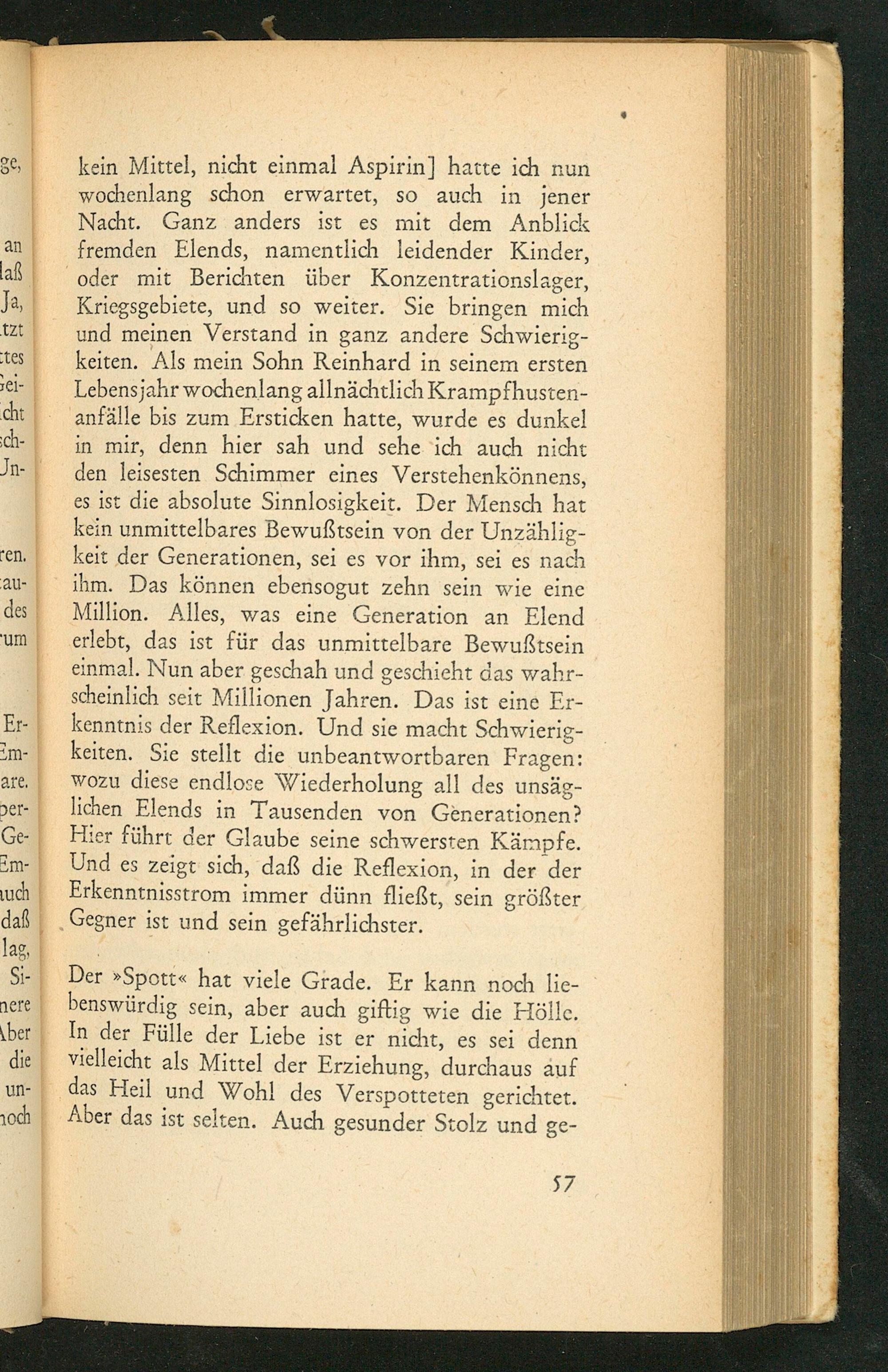 kein Mittel, nicht einmal Aspirin] hatte ich nun wochenlang schon erwartet, so auch in jener Nacht. Ganz anders ist es mit dem Anblick fremden Elends, namentlich leidender Kinder, oder mit Berichten über Konzentrationslager, Kriegsgebiete, und so weiter. Sie bringen mich und meinen Verstand in ganz andere Schwierig- keiten. Als mein Sohn Reinhard in seinem ersten Lebensjahr wochenlang allnächtlich Krampfhusten- anfälle bis zum Ersticken hatte, wurde es dunkel in mir, denn hier sah und sehe‘ich auch nicht den leisesten Schimmer eines Verstehenkönnens, es ist die absolute Sinnlosigkeit. Der Mensch hat kein unmittelbares Bewußtsein von der Unzählig- keit der Generationen, sei es vor ihm, sei es nach ihm. Das können ebensogut zehn sein wie eine Million. Alles, was eine Generation an Elend erlebt, das ist für das unmittelbare Bewußtsein einmal. Nun aber geschah und geschieht das wahr- scheinlich seit Millionen Jahren. Das ist eine Er- kenntnis der Reflexion. Und sie macht Schwierig- keiten. Sie stellt die unbeantwortbaren Fragen: wozu diese endlose Wiederholung all des unsäg- lichen Elends in Tausenden von Generationen? Hier führt der Glaube seine schwersten Kämpfe. Und es zeigt sich, daß die Reflexion, in der der Erkenntnisstrom immer dünn fließt, sein größter Gegner ist und sein gefährlichster.