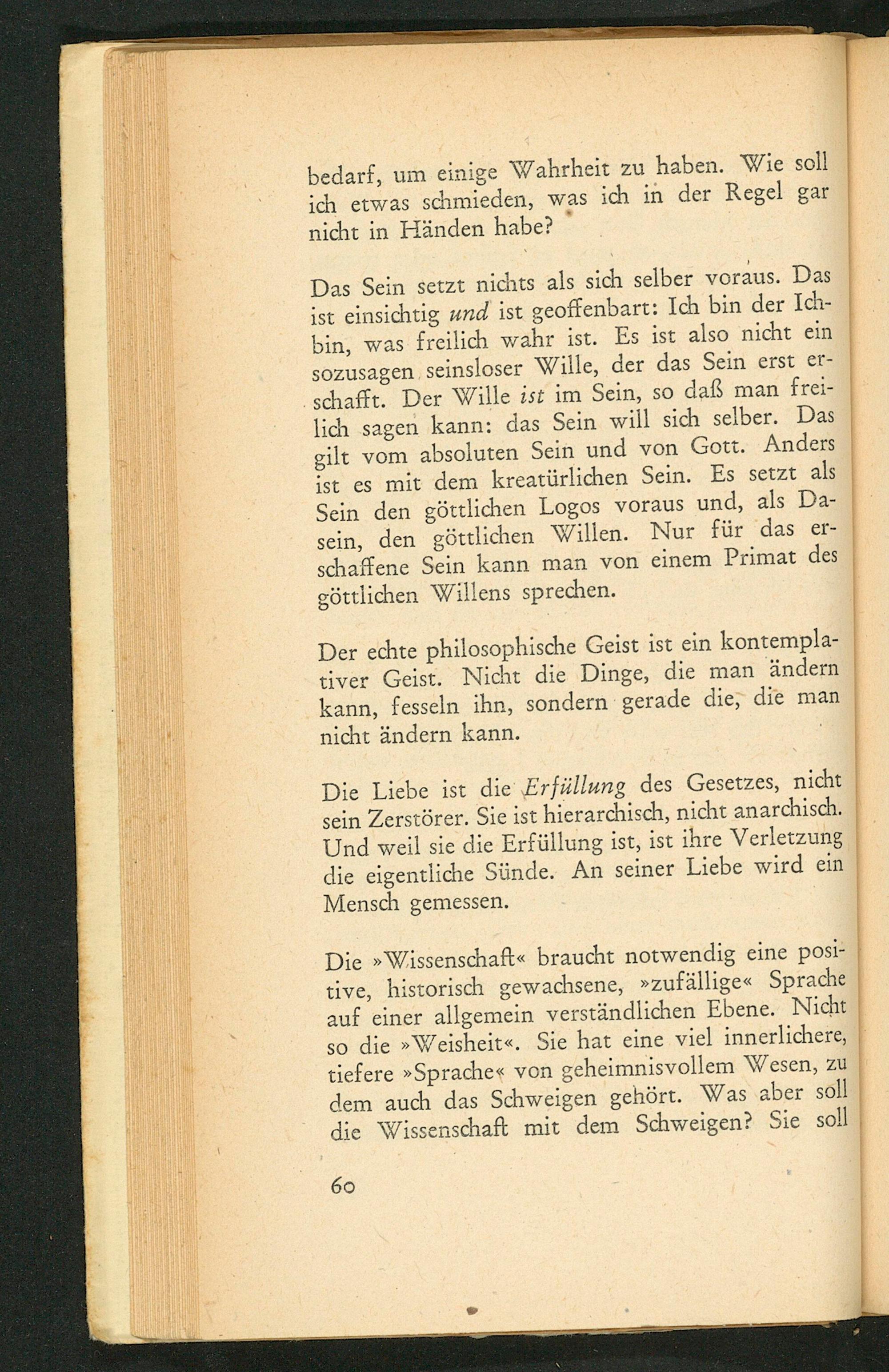 Die» Wissenschaft« braucht notwendig eine positive, historisch gewachsene,» zufällige<< Sprache auf einer allgemein verständlichen Ebene. Nicht so die» Weisheit«. Sie hat eine viel innerlichere, tiefere» Sprache« von geheimnisvollem Wesen, zu dem auch das Schweigen gehört. Was aber soll die Wissenschaft mit dem Schweigen? Sie soll