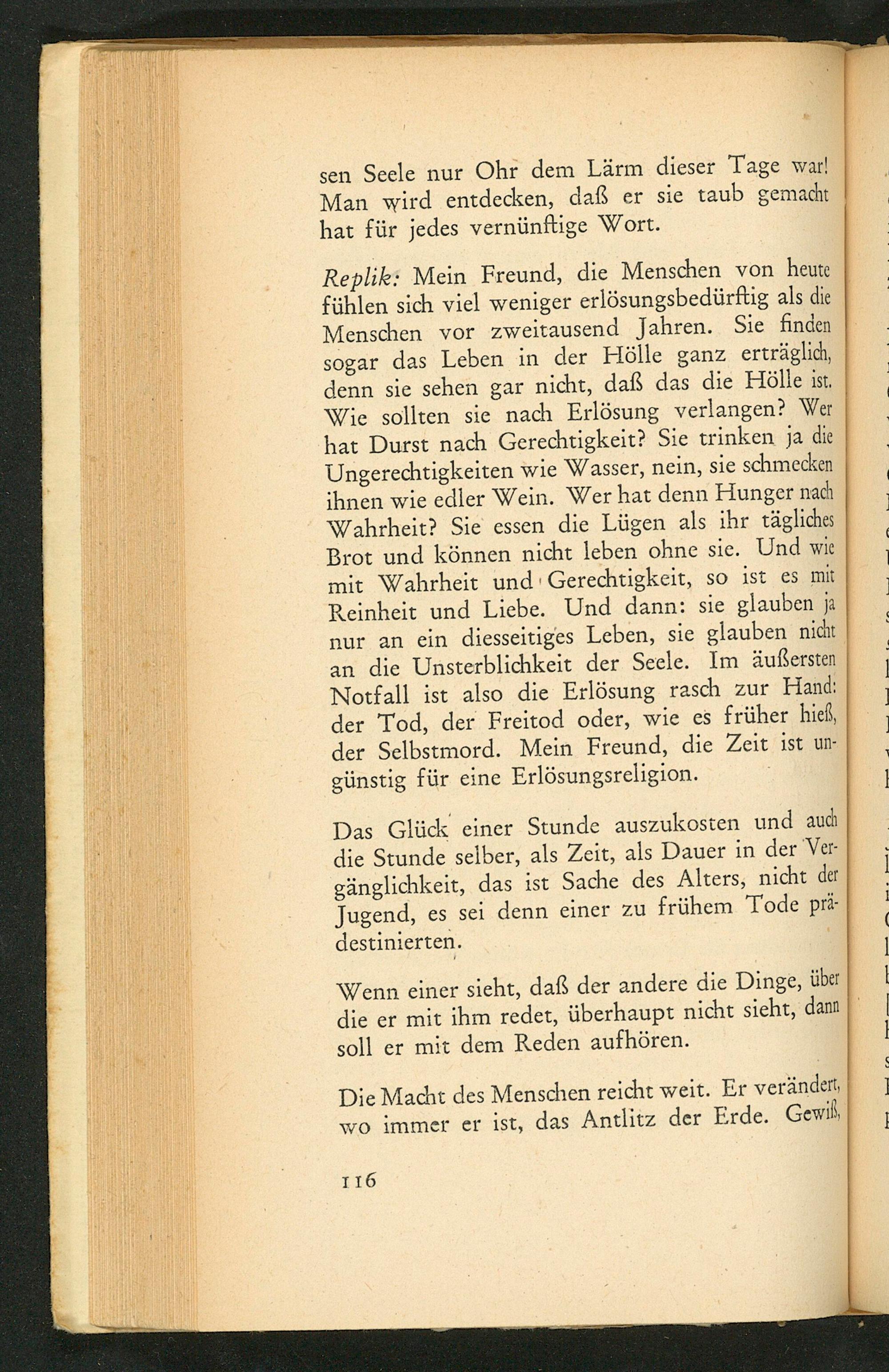 Replik: Mein Freund, die Menschen von heute fühlen sich viel weniger erlösungsbedürftig als die Menschen vor zweitausend Jahren. Sie finden sogar das Leben in der Hölle ganz erträglich, denn sie sehen gar nicht, daß das die Hölle ist. Wie sollten sie nach Erlösung verlangen? Wer hat Durst nach Gerechtigkeit? Sie trinken ja die Ungerechtigkeiten wie Wasser, nein, sie schmecken ihnen wie edler Wein. Wer hat denn Hunger nach Wahrheit? Sie essen die Lügen als ihr tägliches Brot und können nicht leben ohne sie. Und wie mit Wahrheit und Gerechtigkeit, so ist es mit Reinheit und Liebe. Und dann: sie glauben ja nur an ein diesseitiges Leben, sie glauben nicht an die Unsterblichkeit der Seele. Im äußersten Notfall ist also die Erlösung rasch zur Hand: der Tod, der Freitod oder, wie es früher hieß, der Selbstmord. Mein Freund, die Zeit ist ungünstig für eine Erlösungsreligion.