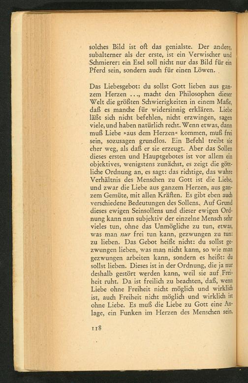 Das Liebesgebot: du sollst Gott lieben aus gan­zem Herzen macht den Philosophen dieser Welt die größten Schwierigkeiten in einem Maße, daß es manche für widersinnig erklären. Liebe läßt sich nicht befehlen, nicht erzwingen, sagen viele, und haben natürlich recht. Wenn etwas, dann muß Liebe» aus dem Herzen« kommen, muß frei sein, sozusagen grundlos. Ein Befehl treibt sie eher weg, als daß er sie erzeugt. Aber das Sollen dieses ersten und Hauptgebotes ist vor allem ein objektives, wenigstens zunächst, es zeigt die gött­liche Ordnung an, es sagt: das richtige, das wahre Verhältnis des Menschen zu Gott ist die Liebe, und zwar die Liebe aus ganzem Herzen, aus gan­zem Gemüte, mit allen Kräften. Es gibt eben auch verschiedene Bedeutungen des Sollens. Auf Grund dieses ewigen Seinsollens und dieser ewigen Ord­nung kann nun subjektiv der einzelne Mensch sehr vieles tun, ohne das Unmögliche zu tun, etwas, was man nur frei tun kann, gezwungen zu tun: zu lieben. Das Gebot heißt nicht: du sollst ge­zwungen lieben, was man nicht kann, so wie man gezwungen arbeiten kann, sondern es heißt: du sollst lieben. Dieses ist in der Ordnung, die ja nur deshalb gestört werden kann, weil sie auf Frei­heit ruht. Da ist freilich zu beachten, daß, wenn Liebe ohne Freiheit nicht möglich und wirklich ist, auch Freiheit nicht möglich und wirklich ist ohne Liebe. Es muß die Liebe zu Gott eine An­lage, ein Funken im Herzen des Menschen sein,