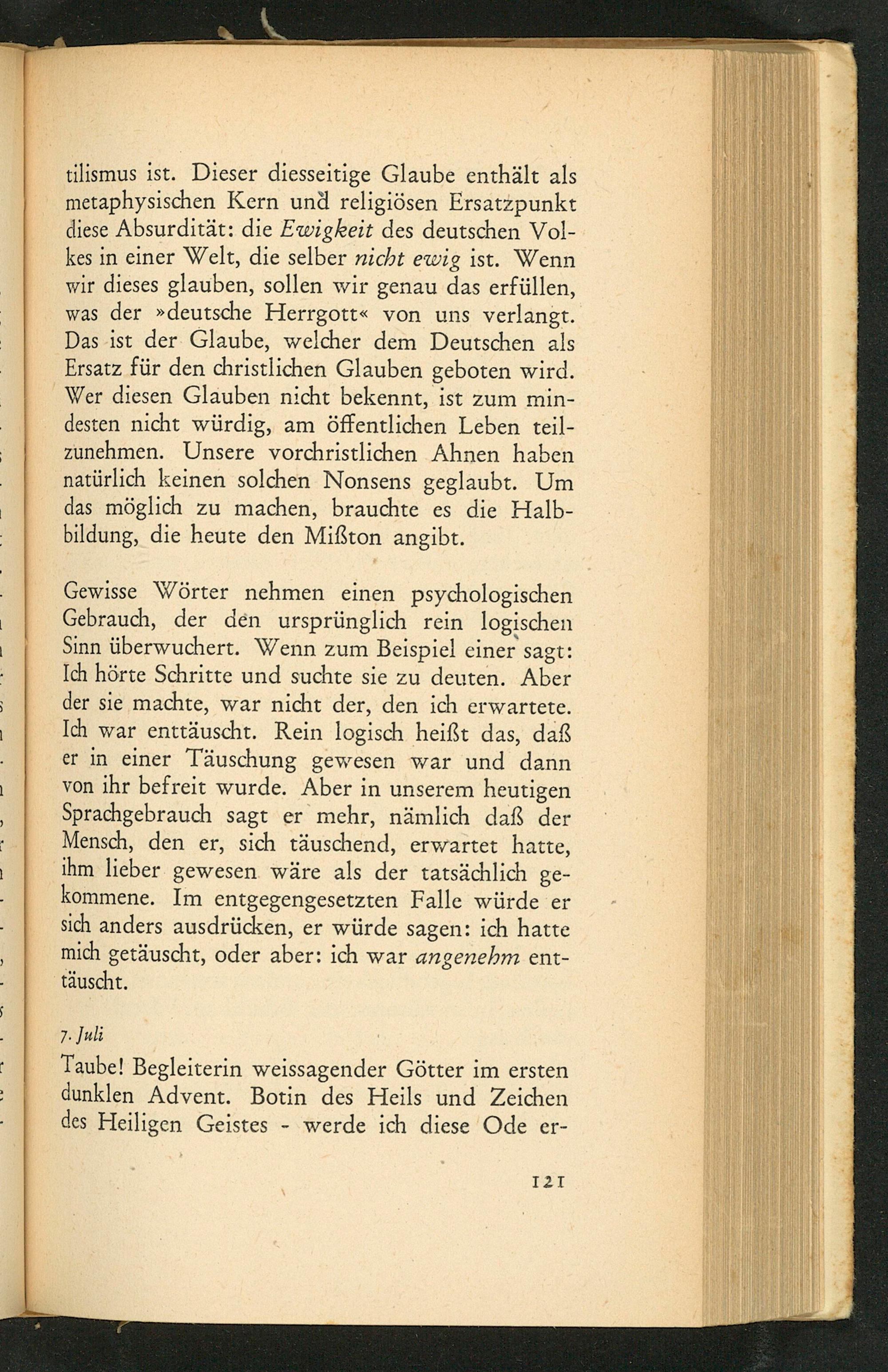 tilismus ist. Dieser diesseitige Glaube enthält als metaphysischen Kern und religiösen Ersatzpunkt diese Absurdität: die Ewigkeit des deutschen Volkes in einer Welt, die selber nicht ewig ist. Wenn wir dieses glauben, sollen wir genau das erfüllen, was der deutsche Herrgott« von uns verlangt. Das ist der Glaube, welcher dem Deutschen als Ersatz für den christlichen Glauben geboten wird. Wer diesen Glauben nicht bekennt, ist zum mindesten nicht würdig, am öffentlichen Leben teilzunehmen. Unsere vorchristlichen Ahnen haben natürlich keinen solchen Nonsens geglaubt. Um das möglich zu machen, brauchte es die Halbbildung, die heute den Mißton angibt.