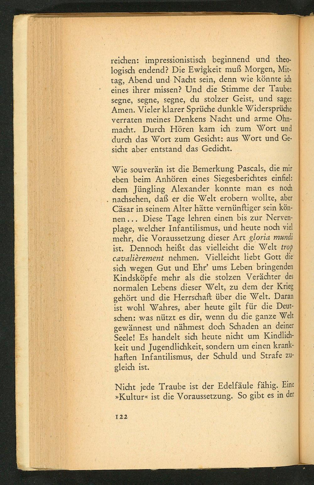 Wie souverän ist die Bemerkung Pascals, die mir eben beim Anhören eines Siegesberichtes einfiel: dem Jüngling Alexander konnte man es noch nachsehen, daß er die Welt erobern wollte, aber Cäsar in seinem Alter hätte vernünftiger sein können... Diese Tage lehren einen bis zur Nervenplage, welcher Infantilismus, und heute noch viel mehr, die Voraussetzung dieser Art gloria mundi ist. Dennoch heißt das vielleicht die Welt trop cavalièrement nehmen. Vielleicht liebt Gott die sich wegen Gut und Ehr' ums Leben bringenden Kindsköpfe mehr als die stolzen Verächter des normalen Lebens dieser Welt, zu dem der Krieg gehört und die Herrschaft über die Welt. Daran ist wohl Wahres, aber heute gilt für die Deutschen : was nützt es dir, wenn du die Welt ganze gewännest und nähmest doch Schaden an deiner Seele! Es handelt sich heute nicht um Kindlichkeit und Jugendlichkeit, sondern um einen krankhaften Infantilismus, der Schuld und Strafe zugleich ist.