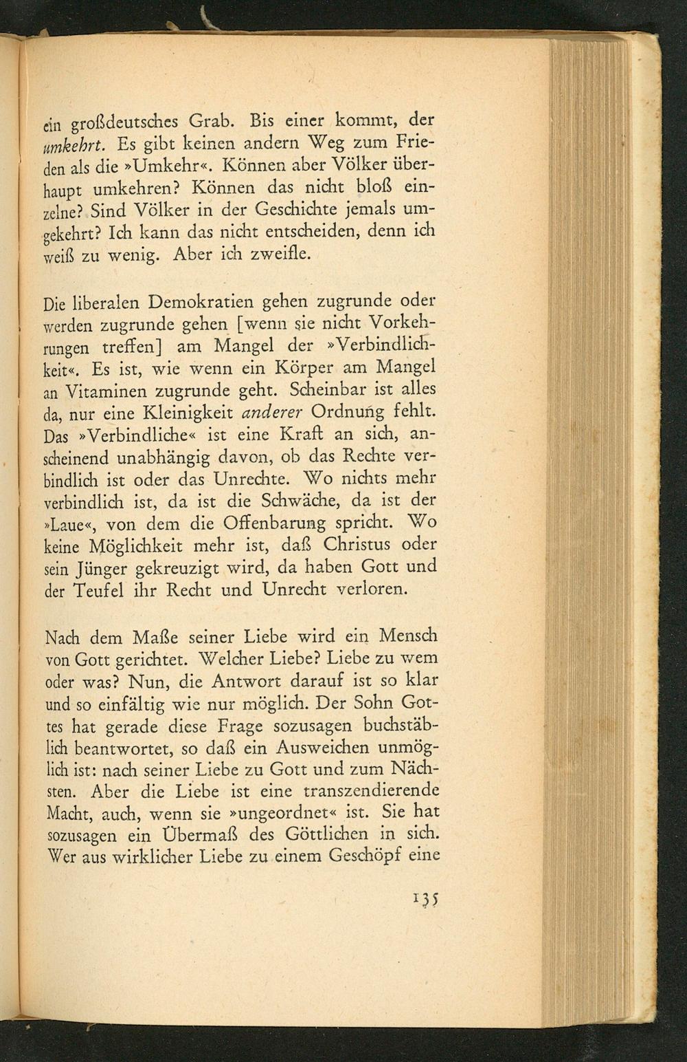 Die liberalen Demokratien gehen zugrunde oder werden zugrunde gehen[ wenn sie nicht Vorkehrungen treffen] am Mangel der» Verbindlichkeit«. Es ist, wie wenn ein Körper am Mangel an Vitaminen zugrunde geht. Scheinbar ist alles da, nur eine Kleinigkeit anderer Ordnung fehlt. Das Verbindliche« ist eine Kraft an sich, anscheinend unabhängig davon, ob das Rechte verbindlich ist oder das Unrechte. Wo nichts mehr verbindlich ist, da ist die Schwäche, da ist der » Laue«, von dem die Offenbarung spricht. Wo keine Möglichkeit mehr ist, daß Christus oder sein Jünger gekreuzigt wird, da haben Gott und der Teufel ihr Recht und Unrecht verloren.