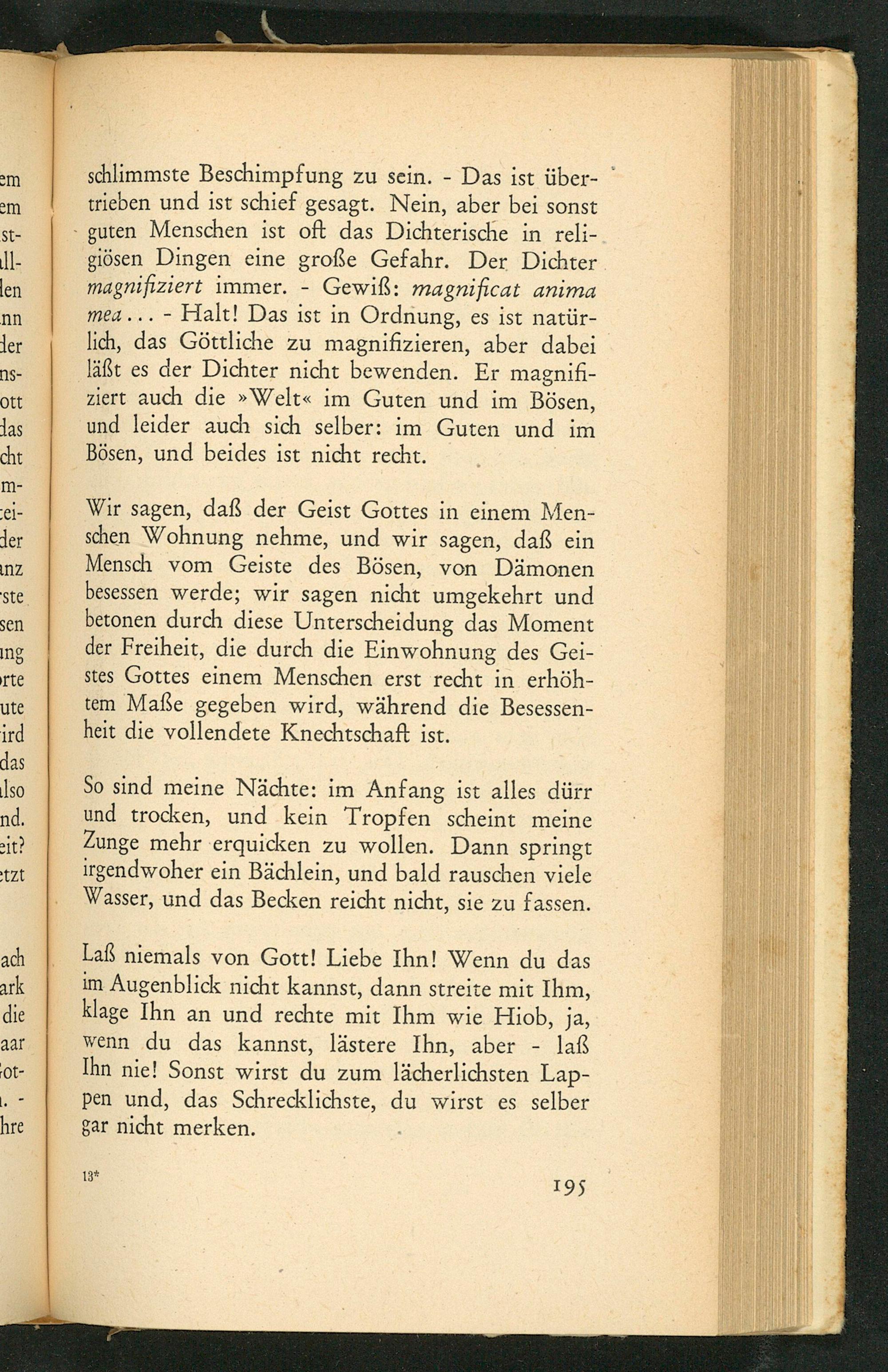Laß niemals von Gott ! Liebe Ihn! Wenn du das im Augenblick nicht kannst, dann streite mit Ihm, klage Ihn an und rechte mit Ihm wie Hiob , ja, wenn du das kannst, lästere Ihn, aber- laß Ihn nie! Sonst wirst du zum lächerlichsten Lap- pen und, das Schrecklichste, du wirst es selber gar nicht merken.