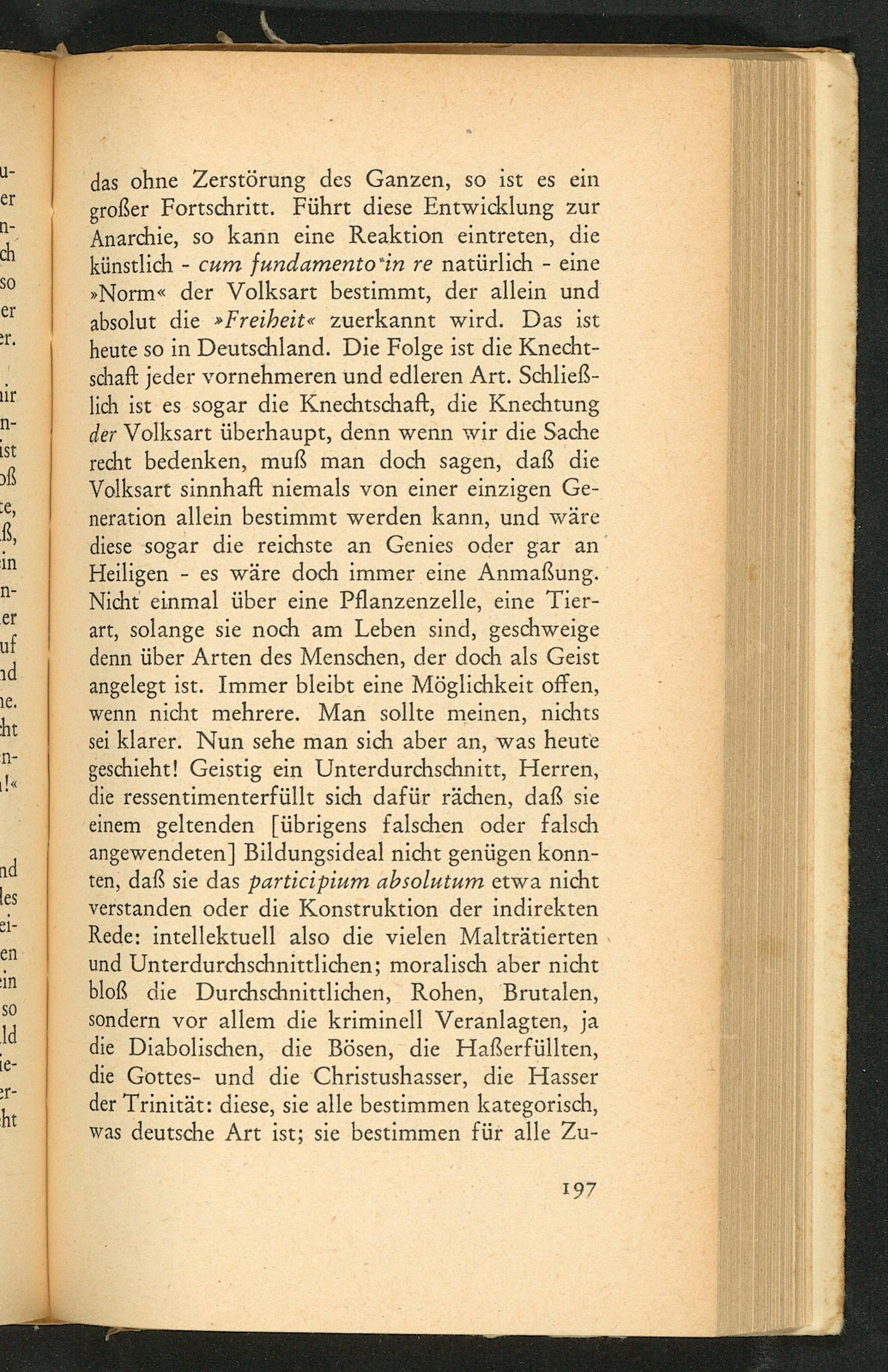 das ohne Zerstörung des Ganzen, so ist es ein großer Fortschritt. Führt diese Entwicklung zur Anarchie, so kann eine Reaktion eintreten, die künstlich- cum fundamento‘in re natürlich- eine »Norm« der Volksart bestimmt, der allein und absolut die»Freiheit« zuerkannt wird. Das ist heute so in Deutschland . Die Folge ist die Knecht- schaft jeder vornehmeren und edleren Art. Schließ- lich ist es sogar die Knechtschaft, die Knechtung der Volksart überhaupt, denn wenn wir die Sache recht bedenken, muß man doch sagen, daß die Volksart sinnhaft niemals von einer einzigen Ge- neration allein bestimmt werden kann, und wäre diese sogar die reichste an Genies oder gar an Heiligen- es wäre doch immer eine Anmaßung. Nicht einmal über eine Pflanzenzelle, eine Tier- art, solange sie noch am Leben sind, geschweige denn über Arten des Menschen, der doch als Geist angelegt ist. Immer bleibt eine Möglichkeit offen, wenn nicht mehrere. Man sollte meinen, nichts sei klarer. Nun sehe man sich aber an, was heute geschieht! Geistig ein Unterdurchschnitt, Herren, die ressentimenterfüllt sich dafür rächen, daß sie einem geltenden[übrigens falschen oder falsch angewendeten] Bildungsideal nicht genügen konn- ten, daß sie das participium absolutum etwa nicht verstanden oder die Konstruktion der indirekten Rede: intellektuell also die vielen Malträtierten und Unterdurchschnittlichen; moralisch aber nicht bloß die Durchschnittlichen, Rohen, Brutalen, sondern vor allem die kriminell Veranlagten, ja die Diabolischen, die Bösen, die Haßerfüllten, die Gottes- und die Christushasser, die Hasser der Trinität: diese, sie alle bestimmen kategorisch, was deutsche Art ist; sie bestimmen für alle Zu-