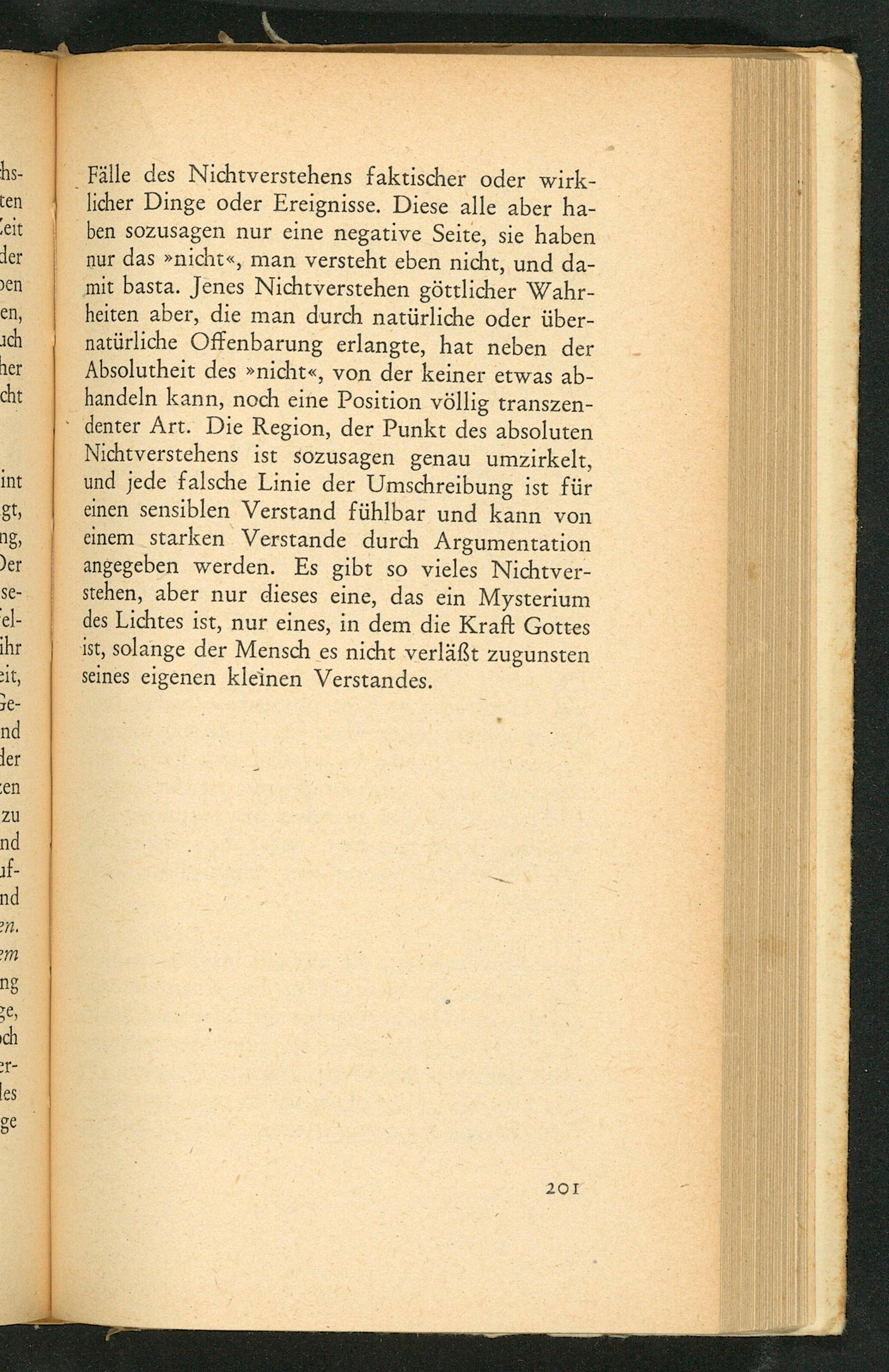 licher Dinge oder Ereignisse. Diese alle aber ha- ben sozusagen nur eine negative Seite, sie haben nur das»nicht«, man versteht eben nicht, und da- mit basta. Jenes Nichtverstehen göttlicher Wahr- heiten aber, die man durch natürliche oder über- natürliche Offenbarung erlangte, hat neben der Absolutheit des»nicht«, von der keiner etwas ab- handeln kann, noch eine Position völlig transzen-