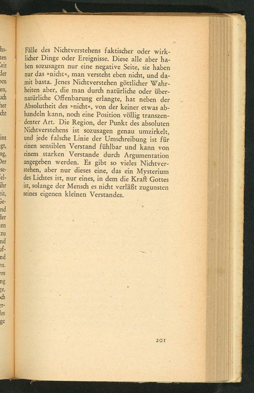 Nichtverstehens ist sozusagen genau umzirkelt, und jede falsche Linie der Umschreibung ist für einen sensiblen Verstand fühlbar und kann von einem starken Verstande durch Argumentation angegeben werden. Es gibt so vieles Nichtver- stehen, aber nur dieses eine, das ein Mysterium des Lichtes ist, nur eines, in dem die Kraft Gottes