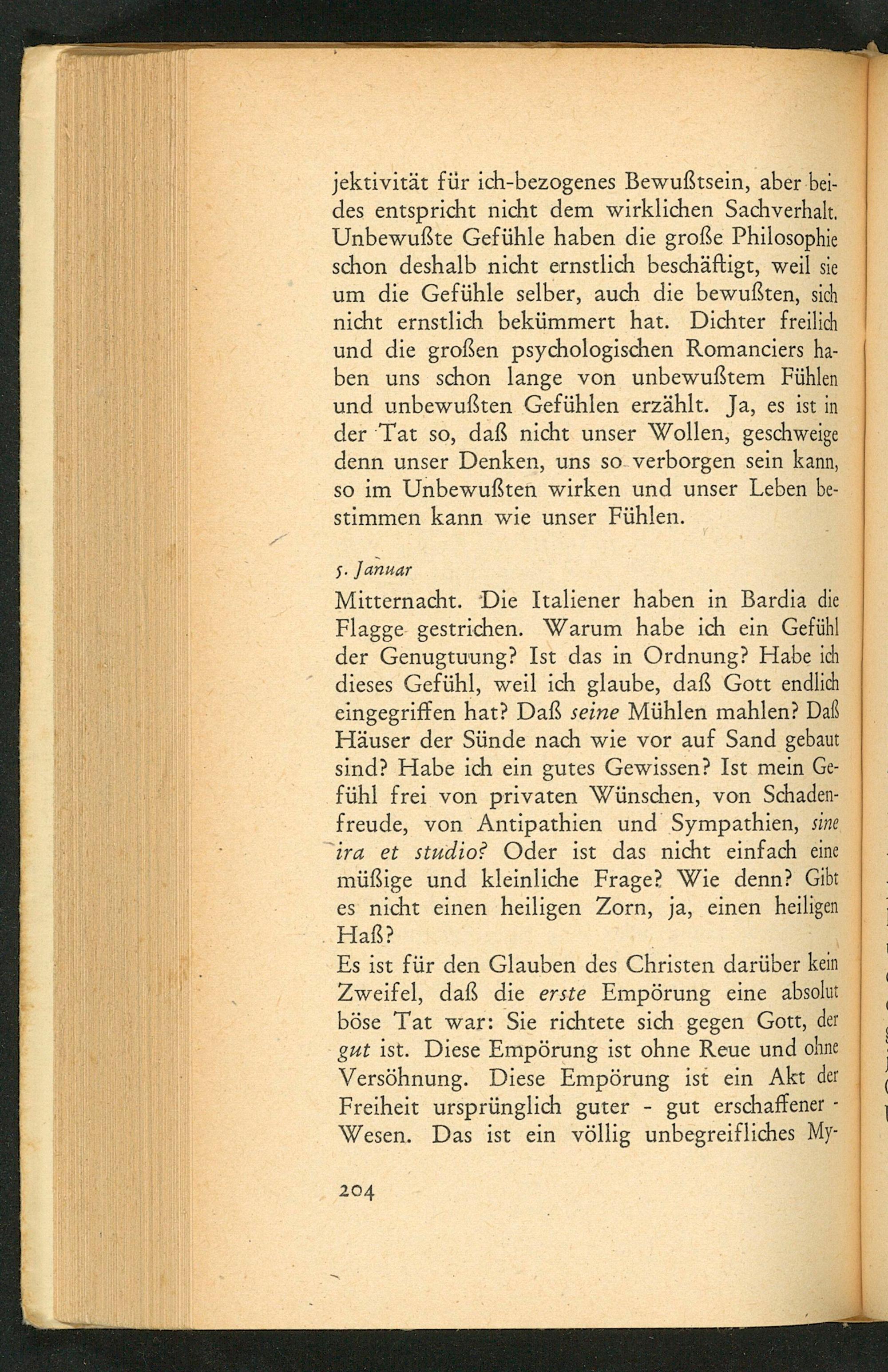 Mitternacht. Die Italiener haben in Bardia die Flagge gestrichen. Warum habe ich ein Gefühl der Genugtuung? Ist das in Ordnung? Habe ich dieses Gefühl, weil ich glaube, daß Gott endlich eingegriffen hat? Daß seine Mühlen mahlen? Daß Häuser der Sünde nach wie vor auf Sand gebaut sind? Habe ich ein gutes Gewissen? Ist mein Gefühl frei von privaten Wünschen, von Schadenfreude, von Antipathien und Sympathien, sine ira et studio? Oder ist das nicht einfach eine müßige und kleinliche Frage? Wie denn? Gibt es nicht einen heiligen Zorn, ja, einen heiligen Haß?