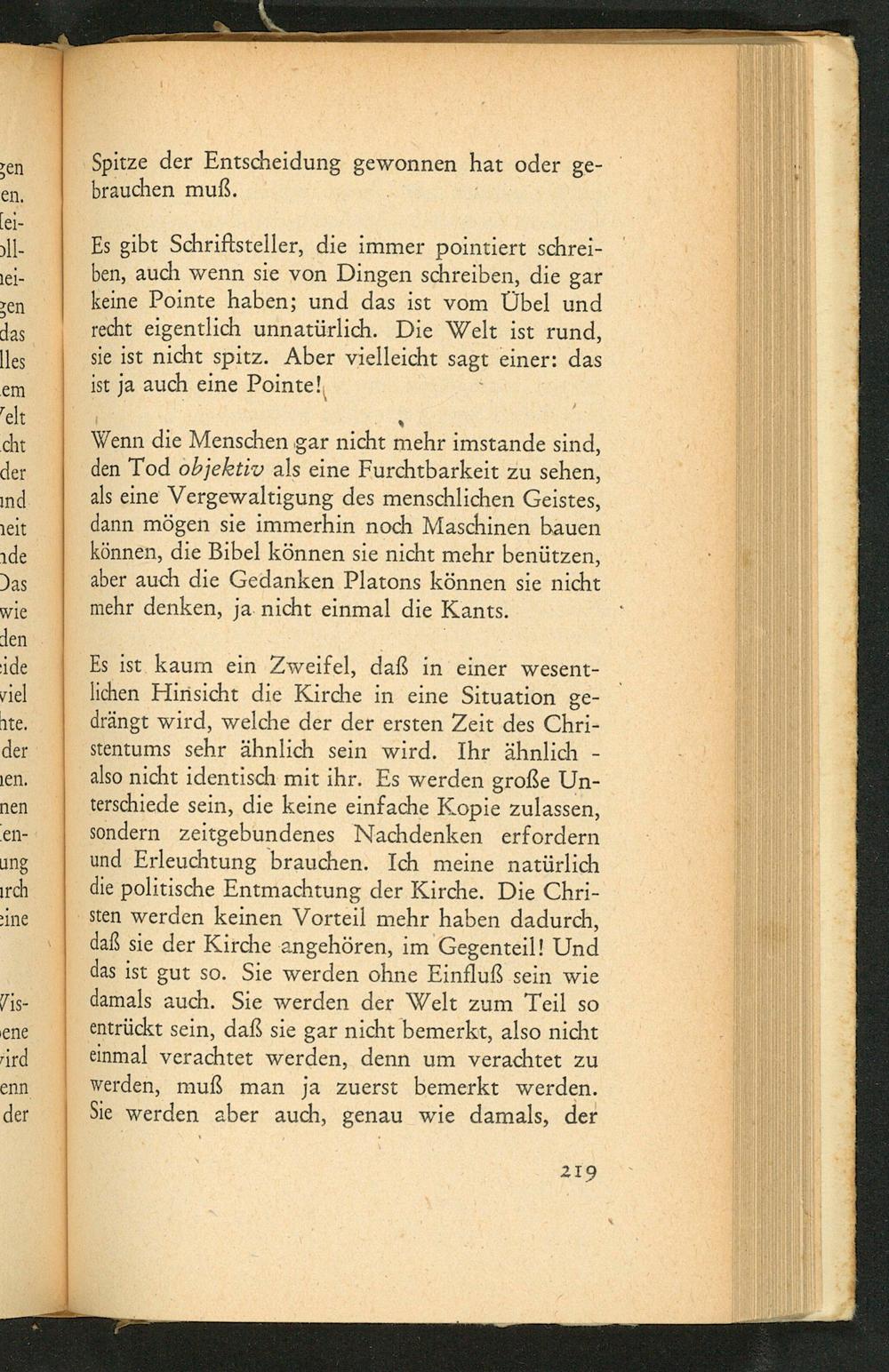 Wenn die Menschen gar nicht mehr imstande sind, den Tod objektiv als eine Furchtbarkeit zu sehen, als eine Vergewaltigung des menschlichen Geistes, dann mögen sie immerhin noch Maschinen bauen können, die Bibel können sie nicht mehr benützen, aber auch die Gedanken Platons können sie nicht mehr denken, ja nicht einmal die Kants.