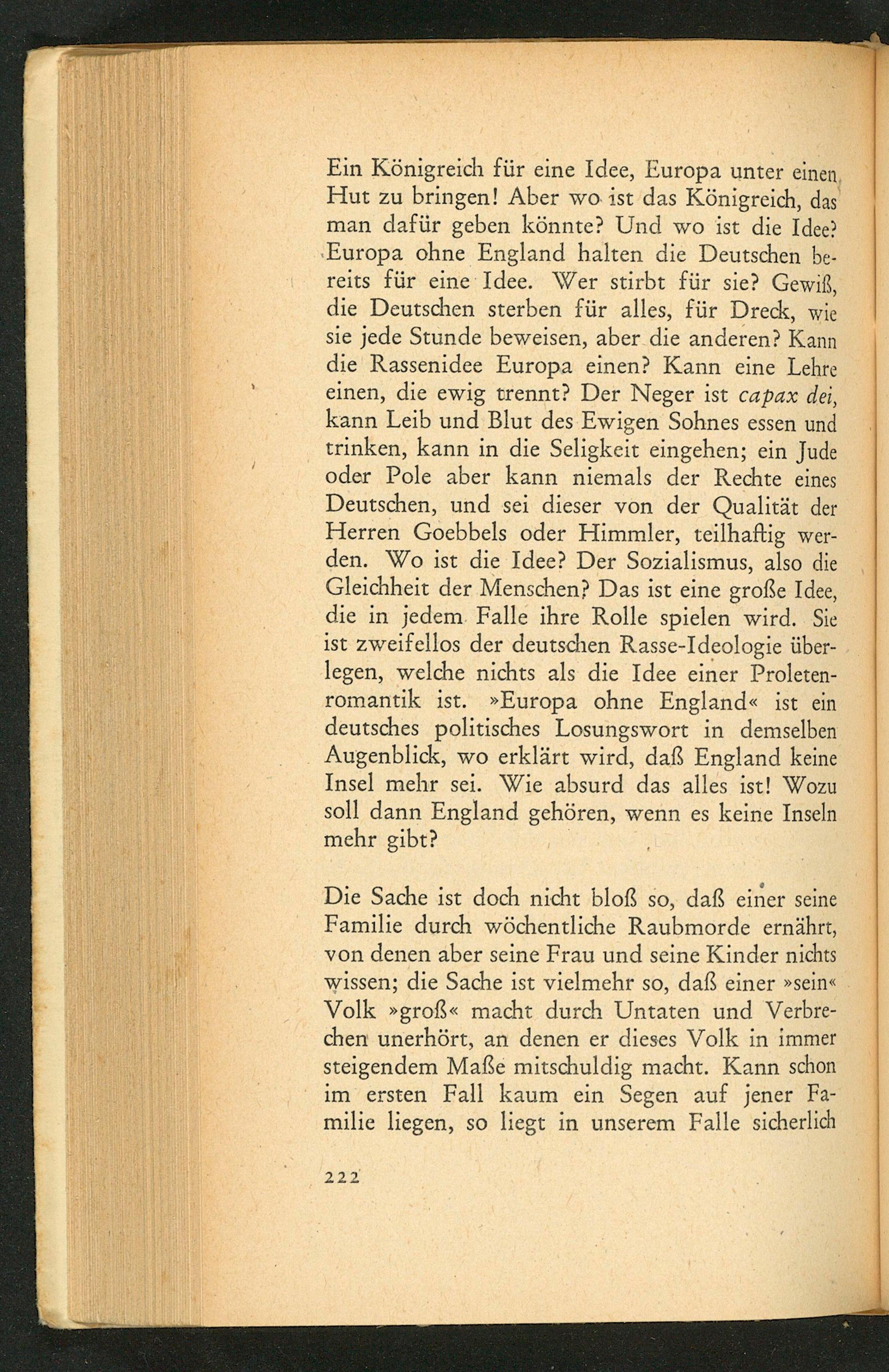 Ein Königreich für eine Idee, Europa unter einen, Hut zu bringen! Aber wo ist das Königreich, das man dafür geben könnte? Und wo ist die Idee? Europa ohne England halten die Deutschen bereits für eine Idee. Wer stirbt für sie? Gewiß, die Deutschen sterben für alles, für Dreck, wie sie jede Stunde beweisen, aber die anderen? Kann die Rassenidee Europa einen? Kann eine Lehre einen, die ewig trennt? Der Neger ist capax dei, kann Leib und Blut des Ewigen Sohnes essen und trinken, kann in die Seligkeit eingehen; ein Jude oder Pole aber kann niemals der Rechte eines Deutschen , und sei dieser von der Qualität der Herren Goebbels oder Himmler, teilhaftig werden. Wo ist die Idee? Der Sozialismus, also die Gleichheit der Menschen? Das ist eine große Idee, die in jedem Falle ihre Rolle spielen wird. Sie ist zweifellos der deutschen Rasse- Ideologie überlegen, welche nichts als die Idee einer Proletenromantik ist.» Europa ohne England« ist ein deutsches politisches Losungswort in demselben Augenblick, wo erklärt wird, daß England keine Insel mehr sei. Wie absurd das alles ist! Wozu soll dann England gehören, wenn es keine Inseln mehr gibt?