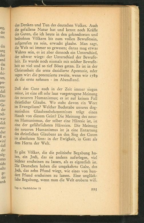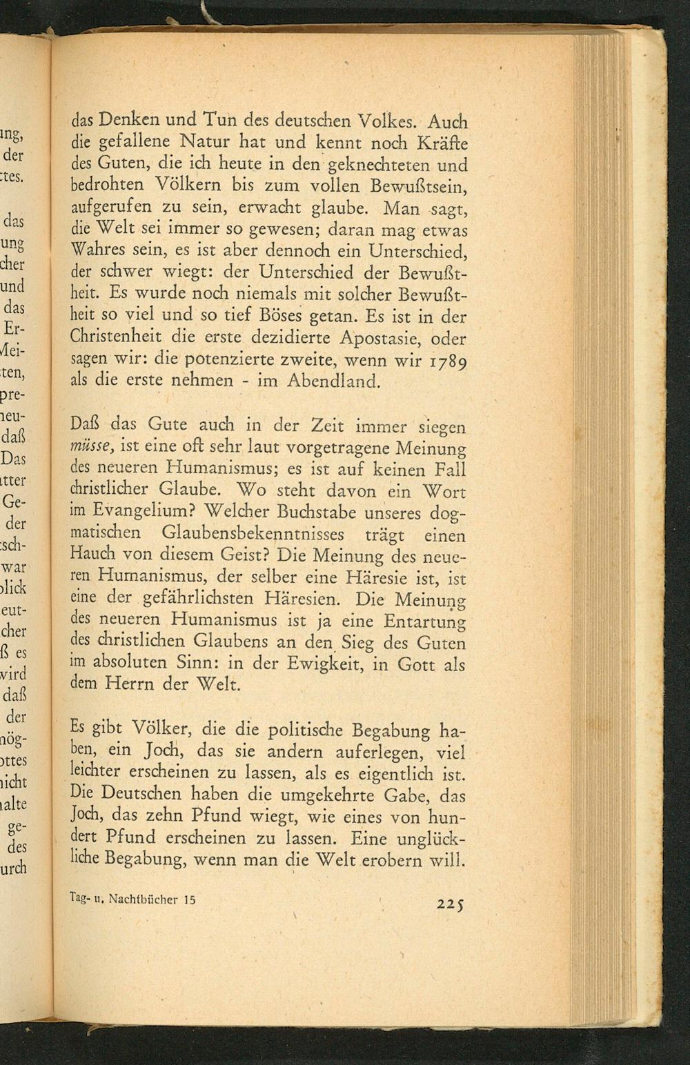 das Denken und Tun des deutschen Volkes. Auch die gefallene Natur hat und kennt noch Kräfte des Guten, die ich heute in den geknechteten und bedrohten Völkern bis zum vollen Bewußtsein, aufgerufen zu sein, erwacht glaube. Man sagt, die Welt sei immer so gewesen; daran mag etwas Wahres sein, es ist aber dennoch ein Unterschied, der schwer wiegt: der Unterschied der Bewußtheit. Es wurde noch niemals mit solcher Bewußtheit so viel und so tief Böses getan. Es ist in der Christenheit die erste dezidierte Apostasie, oder sagen wir: die potenzierte zweite, wenn wir 1789 als die erste nehmen im Abendland.