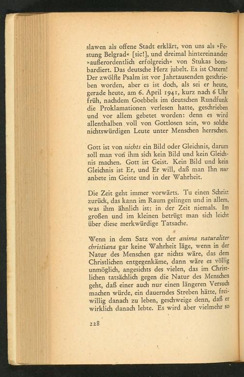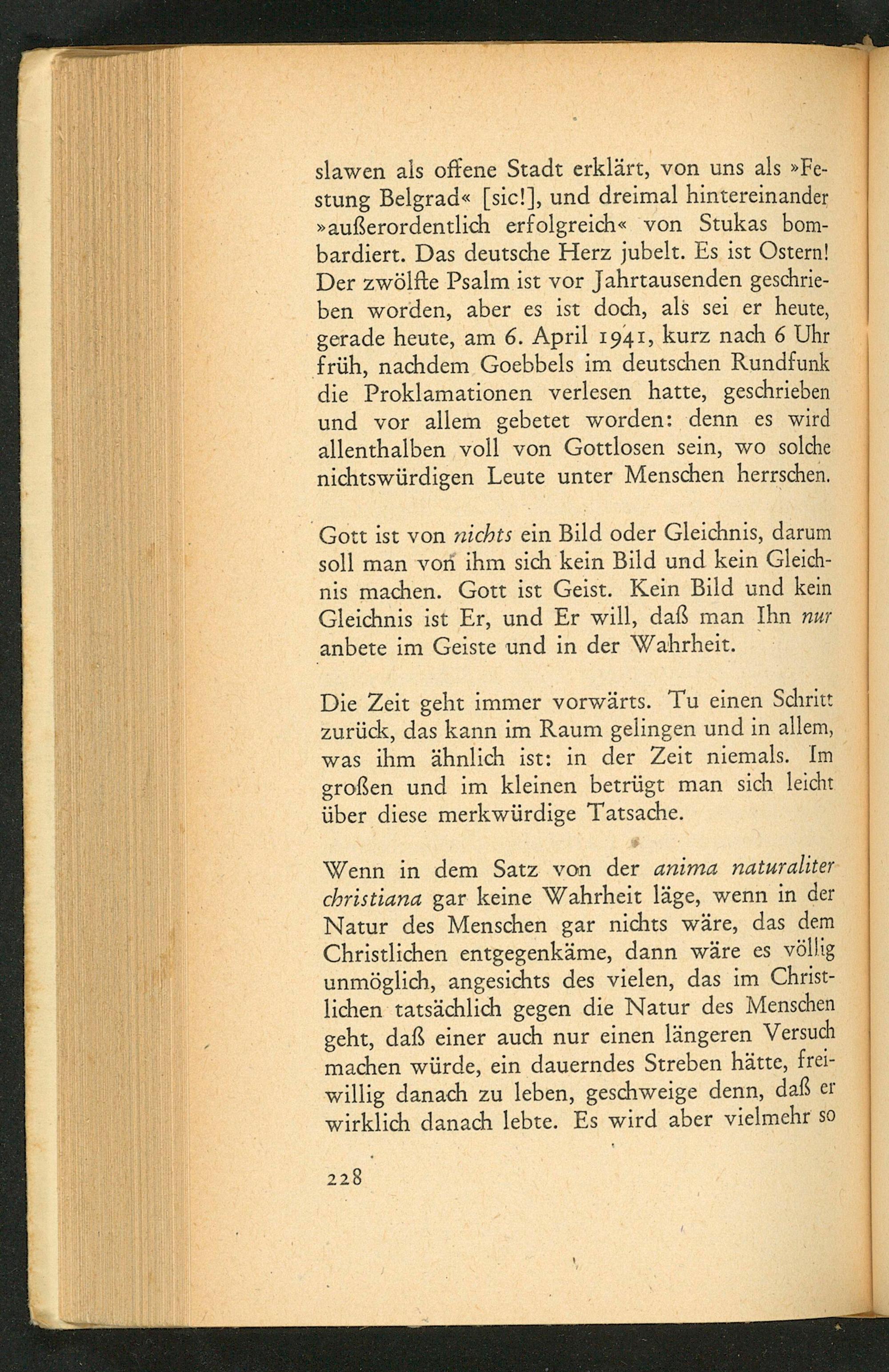slawen als offene Stadt erklärt, von uns als» Festung Belgrad «[ sic!], und dreimal hintereinander » außerordentlich erfolgreich« von Stukas bombardiert. Das deutsche Herz jubelt. Es ist Ostern! Der zwölfte Psalm ist vor Jahrtausenden geschrieben worden, aber es ist doch, als sei er heute, gerade heute, am 6. April 1941, kurz nach 6 Uhr früh, nachdem Goebbels im deutschen Rundfunk die Proklamationen verlesen hatte, geschrieben und vor allem gebetet worden: denn es wird allenthalben voll von Gottlosen sein, wo solche nichtswürdigen Leute unter Menschen herrschen.