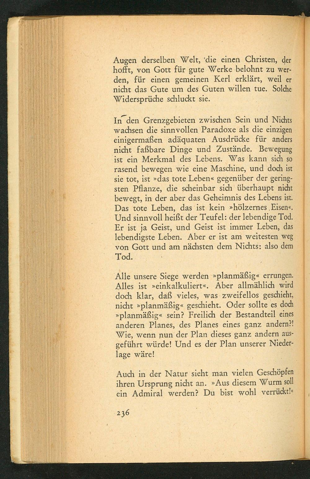 In den Grenzgebieten zwischen Sein und Nichts wachsen die sinnvollen Paradoxe als die einzigen einigermaßen adäquaten Ausdrücke für anders nicht faßbare Dinge und Zustände. Bewegung ist ein Merkmal des Lebens. Was kann sich so rasend bewegen wie eine Maschine, und doch ist sie tot, ist» das tote Leben« gegenüber der geringsten Pflanze, die scheinbar sich überhaupt nicht bewegt, in der aber das Geheimnis des Lebens ist. Das tote Leben, das ist kein» hölzernes Eisen«. Und sinnvoll heißt der Teufel: der lebendige Tod. Er ist ja Geist, und Geist ist immer Leben, das lebendigste Leben. Aber er ist am weitesten weg von Gott und am nächsten dem Nichts: also dem Tod.