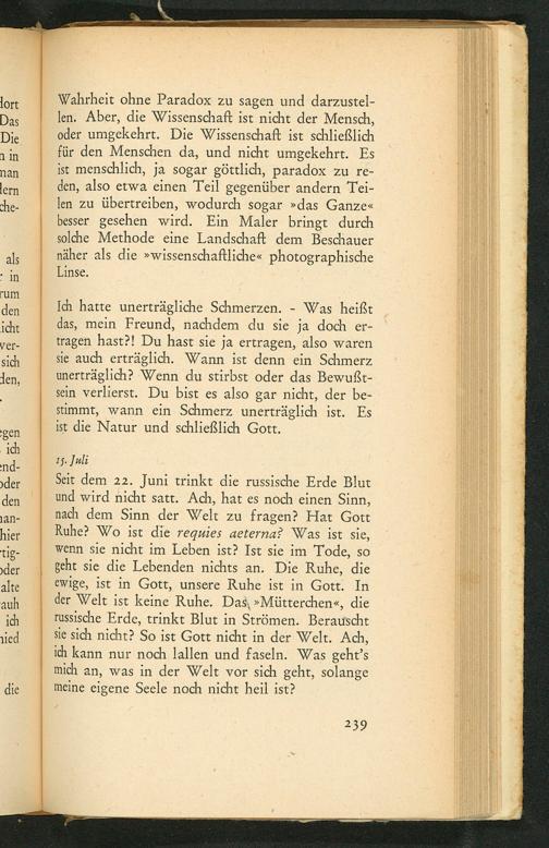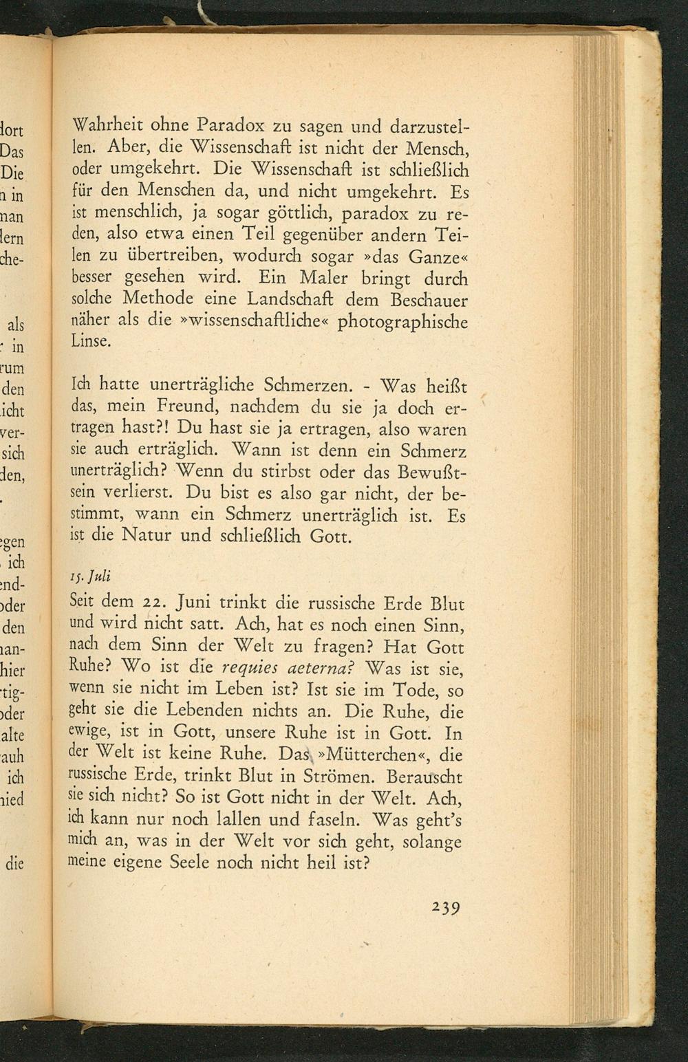 Seit dem 22. Juni trinkt die russische Erde Blut und wird nicht satt. Ach, hat es noch einen Sinn, nach dem Sinn der Welt zu fragen? Hat Gott Ruhe? Wo ist die requies aeterna? Was ist sie, wenn sie nicht im Leben ist? Ist sie im Tode, so geht sie die Lebenden nichts an. Die Ruhe, die ewige, ist in Gott, unsere Ruhe ist in Gott . In der Welt ist keine Ruhe. Das» Mütterchen«, die russische Erde, trinkt Blut in Strömen. Berauscht sie sich nicht? So ist Gott nicht in der Welt. Ach, ich kann nur noch lallen und faseln. Was geht's mich an, was in der Welt vor sich geht, solange meine eigene Seele noch nicht heil ist?