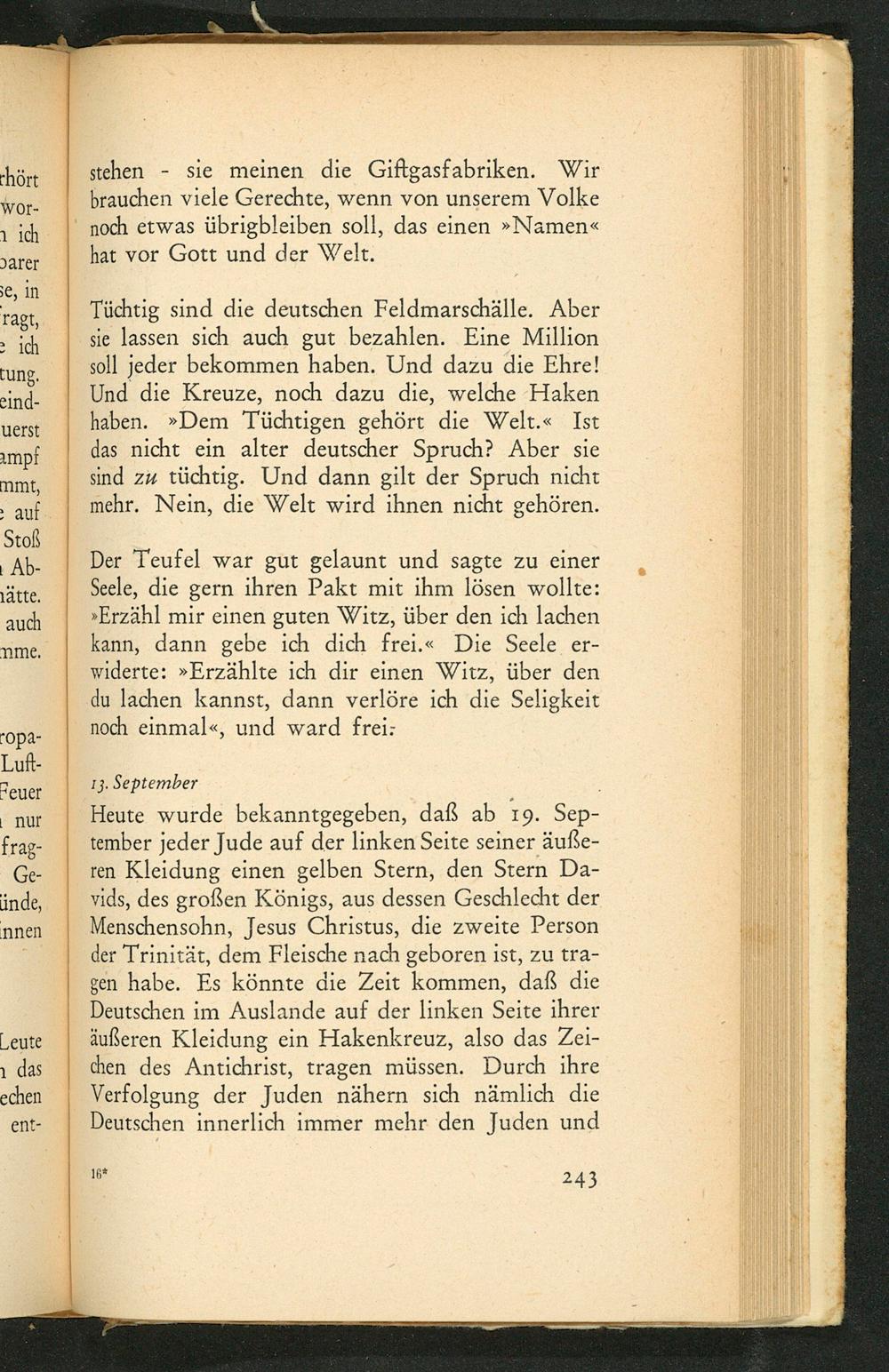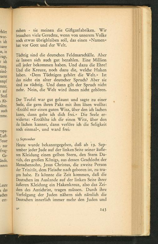 Heute wurde bekanntgegeben, daß ab 19. September jeder Jude auf der linken Seite seiner äußeren Kleidung einen gelben Stern, den Stern Davids, des großen Königs, aus dessen Geschlecht der Menschensohn, Jesus Christus , die zweite Person der Trinität, dem Fleische nach geboren ist, zu tragen habe. Es könnte die Zeit kommen, daß die Deutschen im Auslande auf der linken Seite ihrer äußeren Kleidung ein Hakenkreuz, also das Zeichen des Antichrist, tragen müssen. Durch ihre Verfolgung der Juden nähern sich nämlich die Deutschen innerlich immer mehr den Juden und