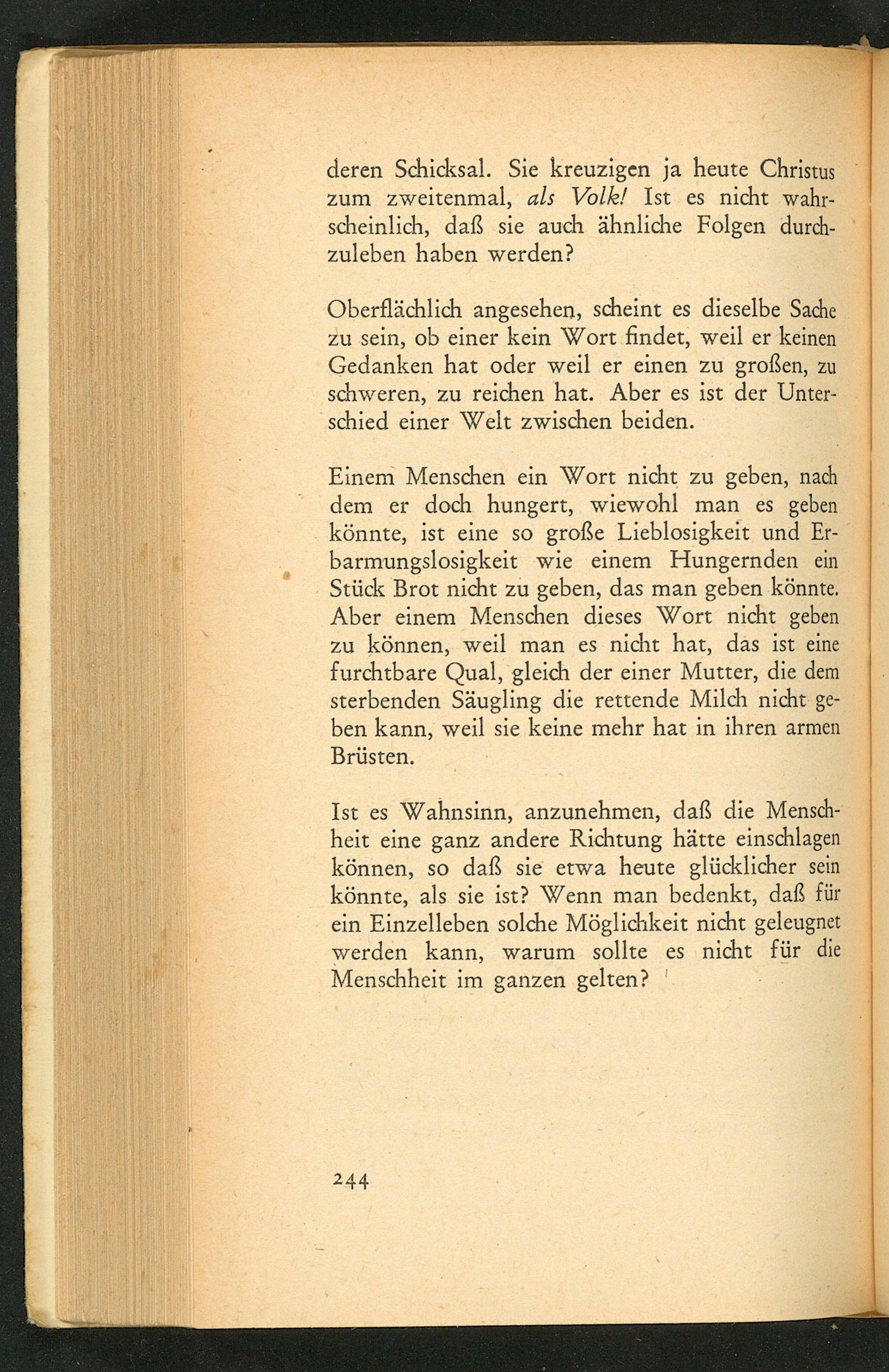Einem Menschen ein Wort nicht zu geben, nach dem er doch hungert, wiewohl man es geben könnte, ist eine so große Lieblosigkeit und Erbarmungslosigkeit wie einem Hungernden ein Stück Brot nicht zu geben, das man geben könnte. Aber einem Menschen dieses Wort nicht geben zu können, weil man es nicht hat, das ist eine furchtbare Qual, gleich der einer Mutter, die dem sterbenden Säugling die rettende Milch nicht geben kann, weil sie keine mehr hat in ihren armen Brüsten.