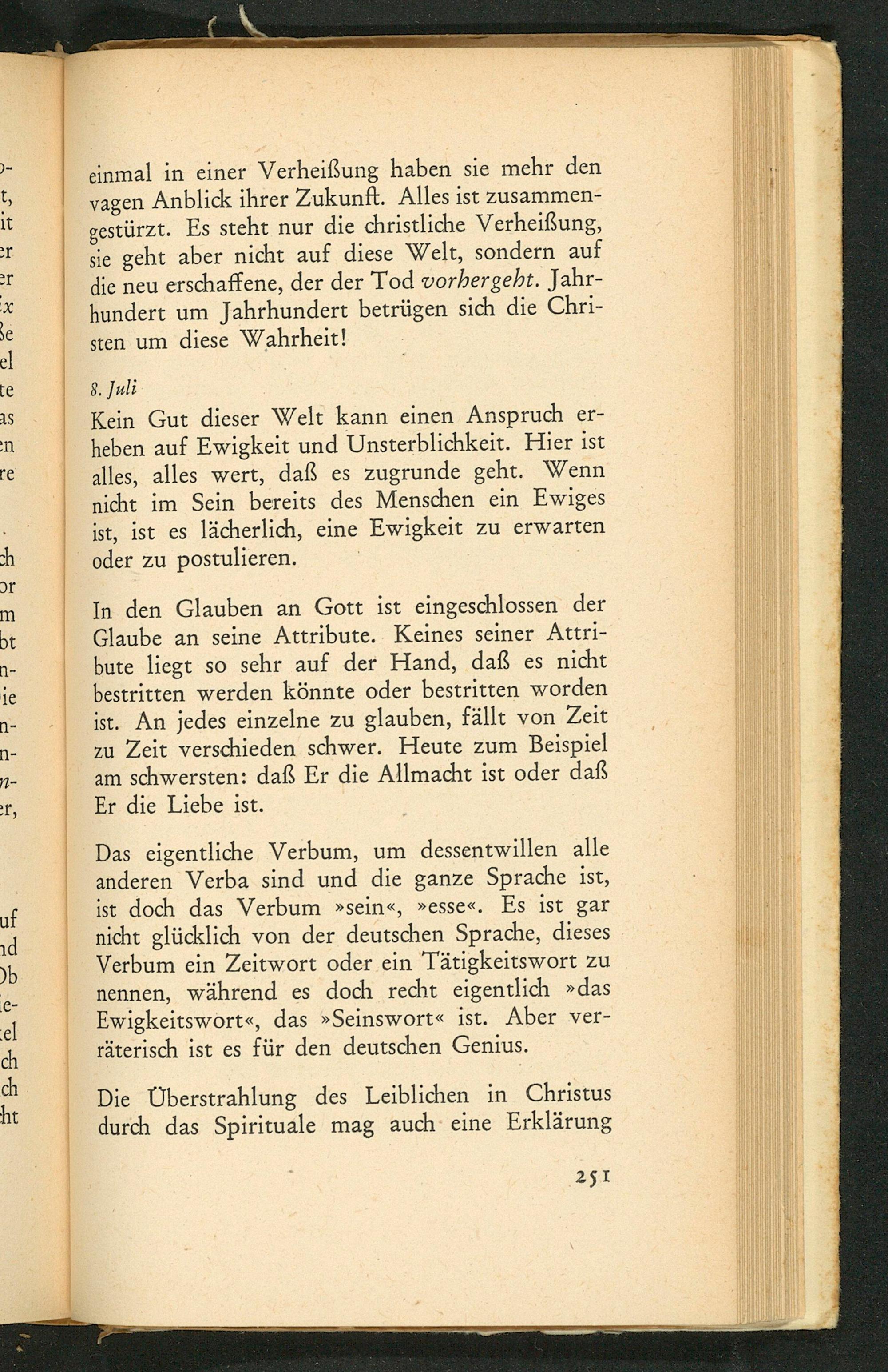 Das eigentliche Verbum, um dessentwillen alle anderen Verba sind und die ganze Sprache ist, ist doch das Verbum»sein«,»esse«. Es ist gar nicht glücklich von der deutschen Sprache, dieses Verbum ein Zeitwort oder ein Tätigkeitswort zu nennen, während es doch recht eigentlich»das Ewigkeitswort«, das»Seinswort« ist. Aber ver- räterisch ist es für den deutschen Genius.