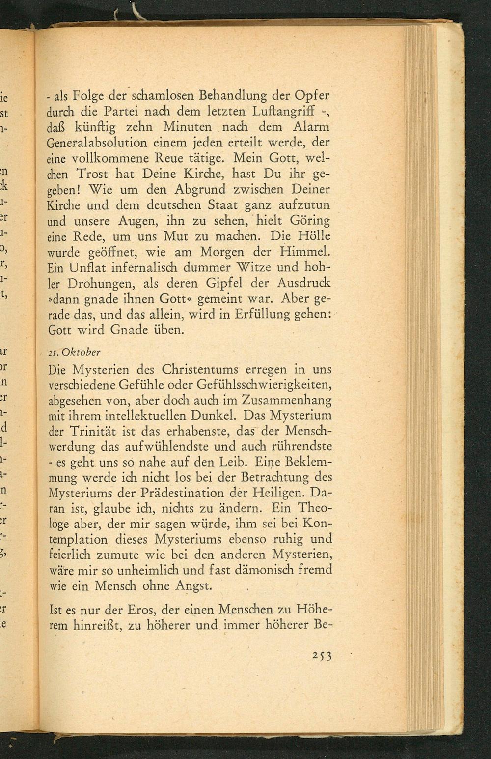 - als Folge der schamlosen Behandlung der Opfer durch die Partei nach dem letzten Luftangriff-, daß künftig zehn Minuten nach dem Alarm Generalabsolution einem jeden erteilt werde, der eine vollkommene Reue tätige. Mein Gott, wel- chen Trost hat Deine Kirche, hast Du ihr ge- geben! Wie um den Abgrund zwischen Deiner Kirche und dem deutschen Staat ganz aufzutun und unsere Augen, ihn zu sehen, hielt Göring eine Rede, um uns Mut zu machen. Die Hölle wurde geöffnet, wie am Morgen der Himmel. Ein Unflat infernalisch dummer Witze und hoh- ler Drohungen, als deren Gipfel der Ausdruck »dann gnade ihnen Gott « gemeint war. Aber ge- rade das, und das allein, wird in Erfüllung gehen: Gott wird Gnade üben.