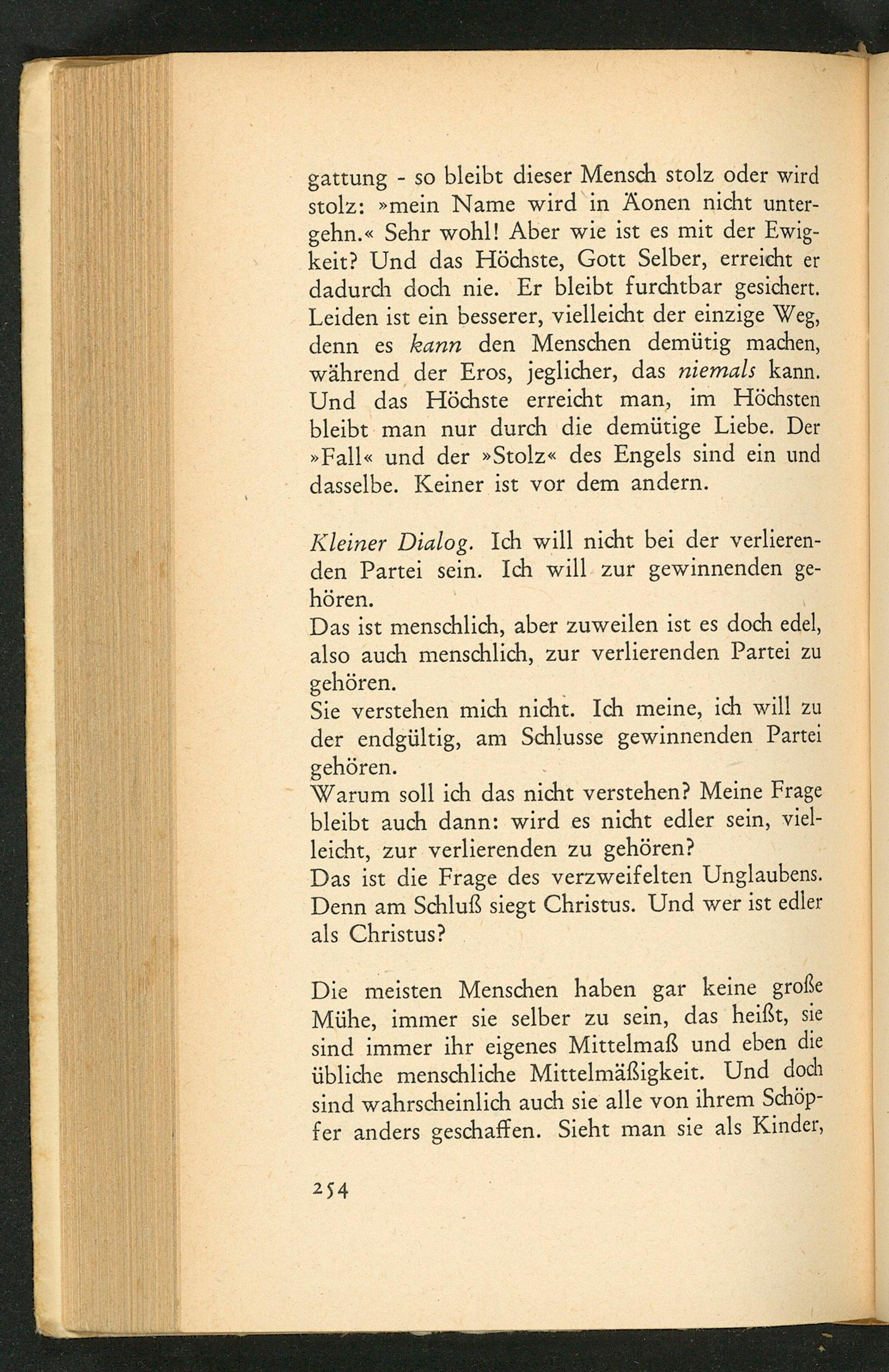 gattung so bleibt dieser Mensch stolz oder wird stolz:» mein Name wird in Aonen nicht untergehn. Sehr wohl! Aber wie ist es mit der Ewigkeit? Und das Höchste, Gott Selber, erreicht er dadurch doch nie. Er bleibt furchtbar gesichert. Leiden ist ein besserer, vielleicht der einzige Weg, denn es kann den Menschen demütig machen, während der Eros, jeglicher, das niemals kann. Und das Höchste erreicht man, im Höchsten bleibt man nur durch die demütige Liebe. Der » Fall« und der» Stolz« des Engels sind ein und dasselbe. Keiner ist vor dem andern.