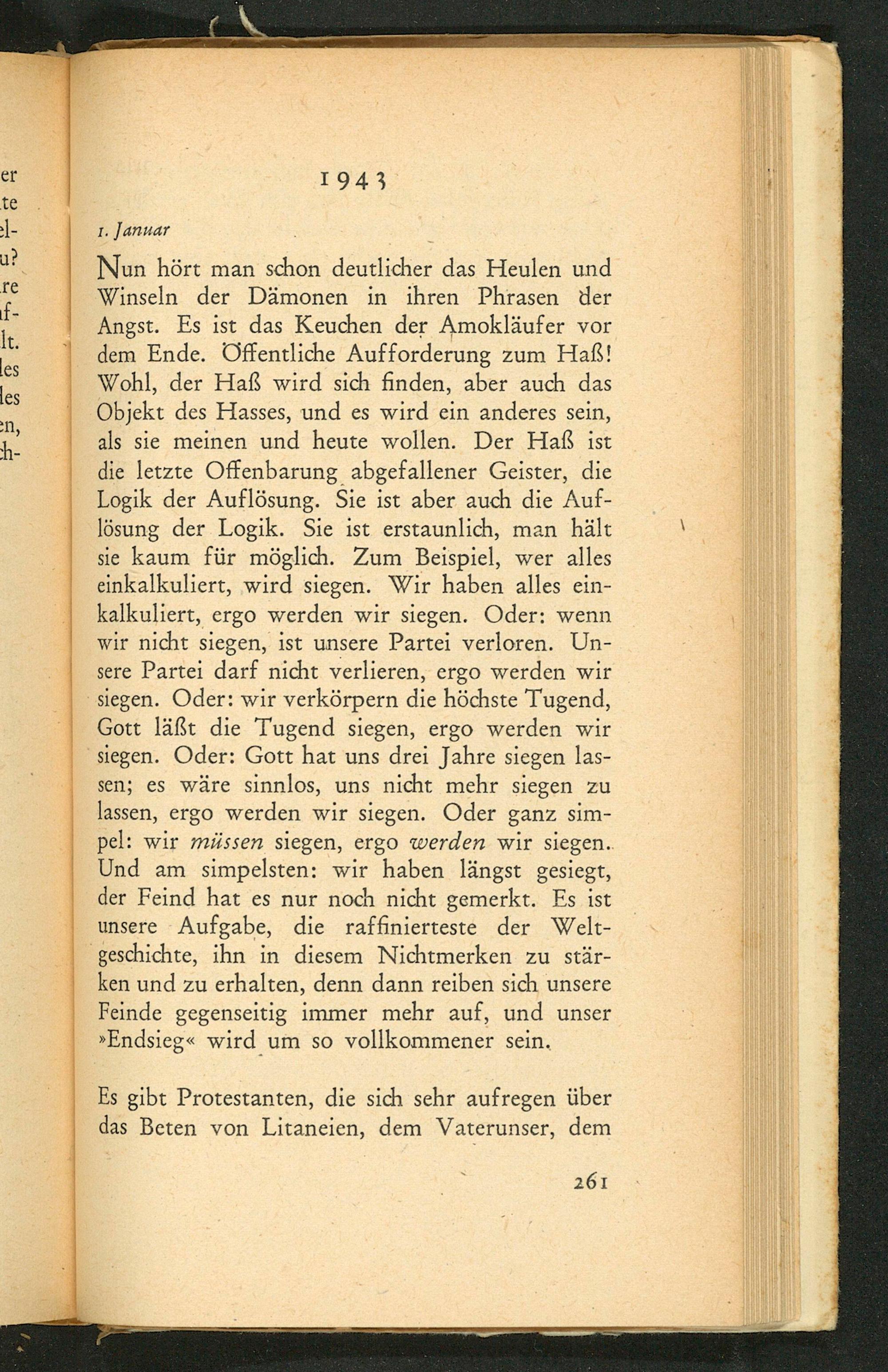 Nun hört man schon deutlicher das Heulen und Winseln der Dämonen in ihren Phrasen der Angst. Es ist das Keuchen der Amokläufer vor dem Ende. Öffentliche Aufforderung zum Haẞ! Wohl, der Haß wird sich finden, aber auch das Objekt des Hasses, und es wird ein anderes sein, als sie meinen und heute wollen. Der Haß ist die letzte Offenbarung abgefallener Geister, die Logik der Auflösung. Sie ist aber auch die Auflösung der Logik. Sie ist erstaunlich, man hält sie kaum für möglich. Zum Beispiel, wer alles einkalkuliert, wird siegen. Wir haben alles einkalkuliert, ergo werden wir siegen. Oder: wenn wir nicht siegen, ist unsere Partei verloren. Unsere Partei darf nicht verlieren, ergo werden wir siegen. Oder: wir verkörpern die höchste Tugend, Gott läßt die Tugend siegen, ergo werden wir siegen. Oder: Gott hat uns drei Jahre siegen lassen; es wäre sinnlos, uns nicht mehr siegen zu lassen, ergo werden wir siegen. Oder ganz simpel: wir müssen siegen, ergo werden wir siegen.. Und am simpelsten: wir haben längst gesiegt, der Feind hat es nur noch nicht gemerkt. Es ist unsere Aufgabe, die raffinierteste der Weltgeschichte, ihn in diesem Nichtmerken zu stärken und zu erhalten, denn dann reiben sich unsere Feinde gegenseitig immer mehr auf, und unser » Endsieg« wird um so vollkommener sein.