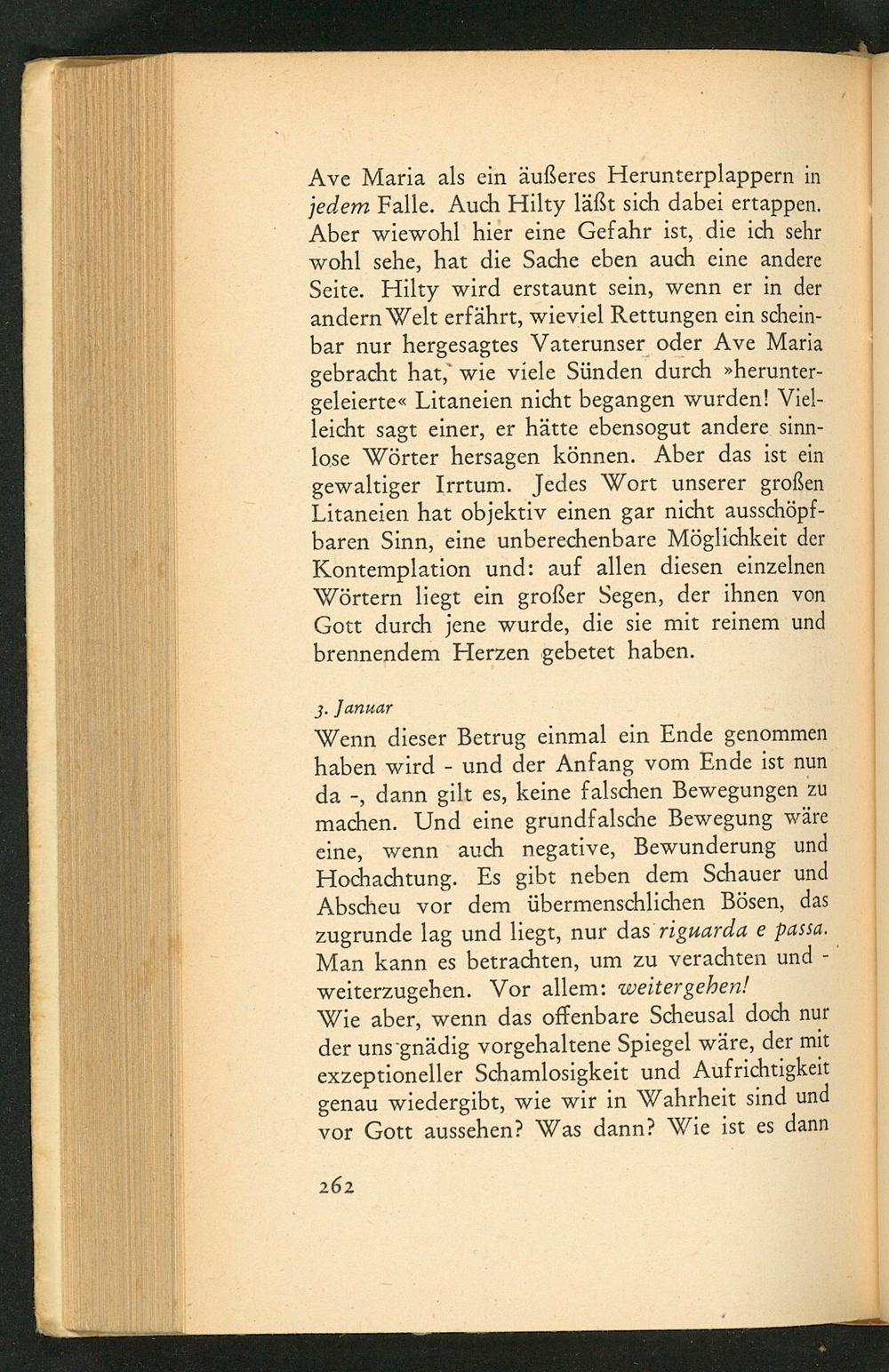 Ave Maria als ein äußeres Herunterplappern in jedem Falle. Auch Hilty läßt sich dabei ertappen. Aber wiewohl hier eine Gefahr ist, die ich sehr wohl sehe, hat die Sache eben auch eine andere Seite. Hilty wird erstaunt sein, wenn er in der andern Welt erfährt, wieviel Rettungen ein schein- bar nur hergesagtes Vaterunser oder Ave Maria gebracht hat, wie viele Sünden durch»herunter- geleierte« Litaneien nicht begangen wurden! Viel- leicht sagt einer, er hätte ebensogut andere sinn- lose Wörter hersagen können. Aber das ist ein gewaltiger Irrtum. Jedes Wort unserer großen Litaneien hat objektiv einen gar nicht ausschöpf- baren Sinn, eine unberechenbare Möglichkeit der Kontemplation und: auf allen diesen einzelnen Wörtern liegt ein großer Segen, der ihnen von Gott durch jene wurde, die sie mit reinem und brennendem Herzen gebetet haben.