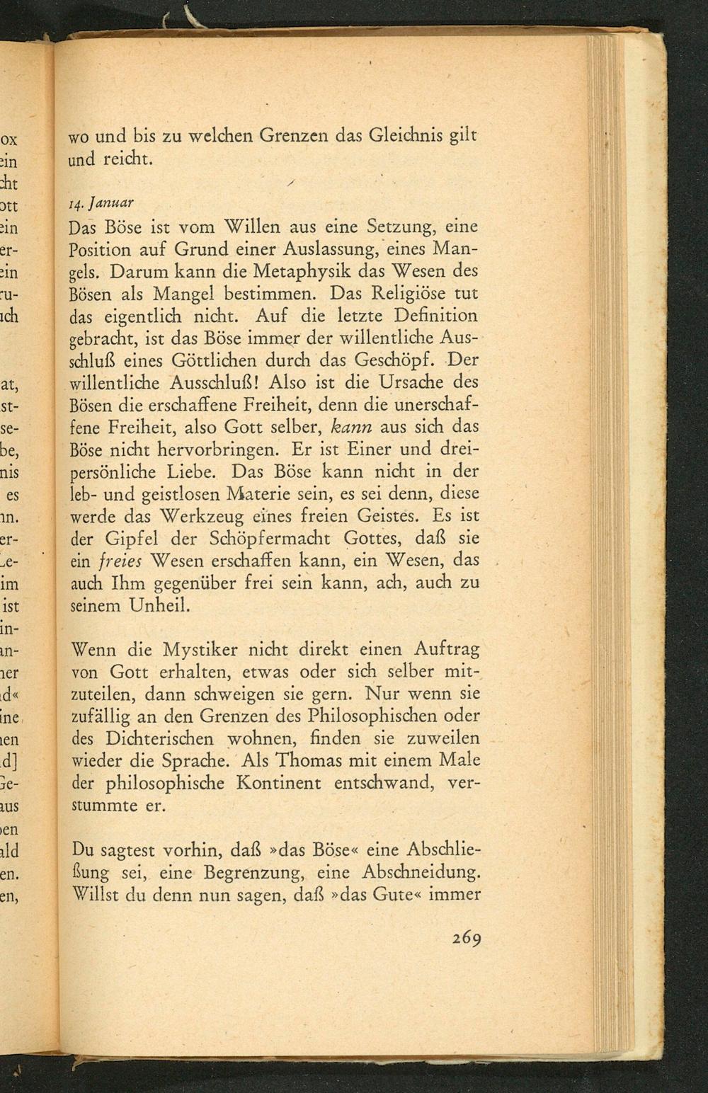 von Gott erhalten, etwas oder sich selber mit- zuteilen, dann schweigen sie gern. Nur wenn sie zufällig an den Grenzen des Philosophischen oder des Dichterischen wohnen, finden sie zuweilen wieder die Sprache. Als Thomas mit einem Male der philosophische Kontinent entschwand, ver- stummte er.