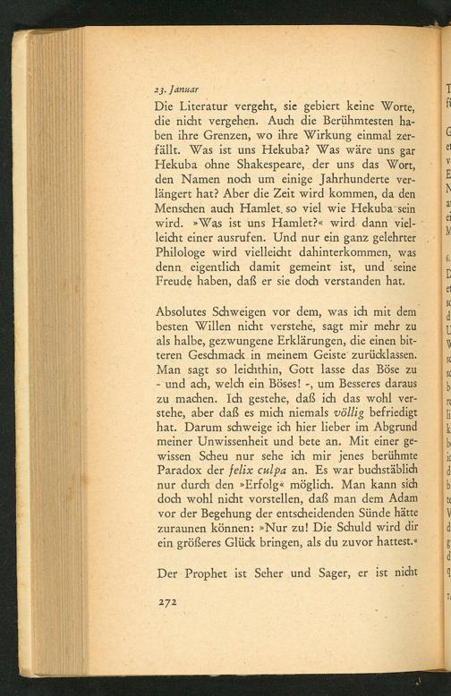 Die Literatur vergeht, sie gebiert keine Worte, die nicht vergehen. Auch die Berühmtesten ha- ben ihre Grenzen, wo ihre Wirkung einmal zer- fällt. Was ist uns Hekuba? Was wäre uns gar Hekuba ohne Shakespeare, der uns das Wort, den Namen noch um einige Jahrhunderte ver- längert hat? Aber die Zeit wird kommen, da den Menschen auch Hamlet, so viel wie Hekuba ’sein