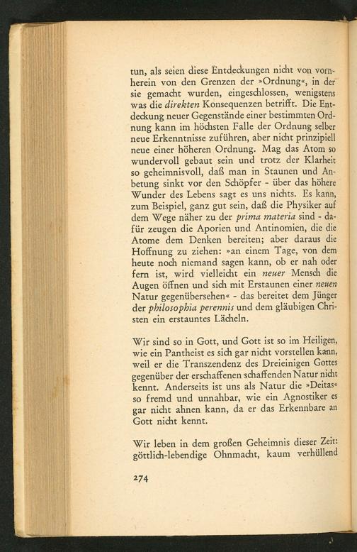 tun, als seien diese Entdeckungen nicht von vornherein von den Grenzen der» Ordnung«, in der sie gemacht wurden, eingeschlossen, wenigstens was die direkten Konsequenzen betrifft. Die Entdeckung neuer Gegenstände einer bestimmten Ordnung kann im höchsten Falle der Ordnung selber neue Erkenntnisse zuführen, aber nicht prinzipiell neue einer höheren Ordnung. Mag das Atom so wundervoll gebaut sein und trotz der Klarheit so geheimnisvoll, daß man in Staunen und Anbetung sinkt vor den Schöpfer- über das höhere Wunder des Lebens sagt es uns nichts. Es kann, zum Beispiel, ganz gut sein, daß die Physiker auf dem Wege näher zu der prima materia sind- dafür zeugen die Aporien und Antinomien, die die Atome dem Denken bereiten; aber daraus die Hoffnung zu ziehen:» an einem Tage, von dem heute noch niemand sagen kann, ob er nah oder fern ist, wird vielleicht ein neuer Mensch die Augen öffnen und sich mit Erstaunen einer neuen Natur gegenübersehen«- das bereitet dem Jünger der philosophia perennis und dem gläubigen Christen ein erstauntes Lächeln.