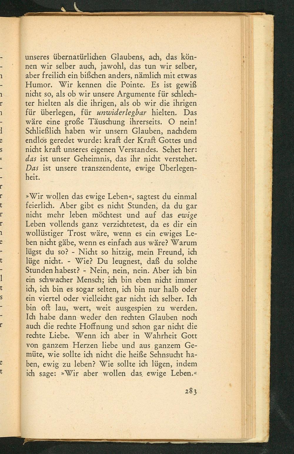 >> Wir wollen das ewige Leben«, sagtest du einmal feierlich. Aber gibt es nicht Stunden, da du gar nicht mehr leben möchtest und auf das ewige Leben vollends ganz verzichtetest, da es dir ein wollüstiger Trost wäre, wenn es ein ewiges Leben nicht gäbe, wenn es einfach aus wäre? Warum lügst du so? Nicht so hitzig, mein Freund, ich lüge nicht. Wie? Du leugnest, daß du solche Stunden habest?- Nein, nein, nein. Aber ich bin ein schwacher Mensch; ich bin eben nicht immer ich, ich bin es sogar selten, ich bin nur halb oder ein viertel oder vielleicht gar nicht ich selber. Ich bin oft lau, wert, weit ausgespien zu werden. Ich habe dann weder den rechten Glauben noch auch die rechte Hoffnung und schon gar nicht die rechte Liebe. Wenn ich aber in Wahrheit Gott von ganzem Herzen liebe und aus ganzem Gemüte, wie sollte ich nicht die heiße Sehnsucht haben, ewig zu leben? Wie sollte ich lügen, indem ich sage:» Wir aber wollen das ewige Leben.<<