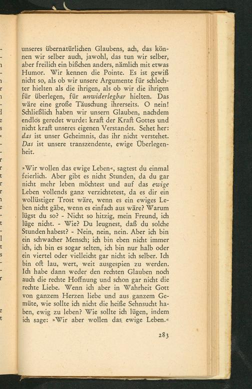 unseres übernatürlichen Glaubens, ach, das können wir selber auch, jawohl, das tun wir selber, aber freilich ein bißchen anders, nämlich mit etwas Humor. Wir kennen die Pointe. Es ist gewiß nicht so, als ob wir unsere Argumente für schlechter hielten als die ihrigen, als ob wir die ihrigen für überlegen, für unwiderlegbar hielten. Das wäre eine große Täuschung ihrerseits. O nein! Schließlich haben wir unsern Glauben, nachdem endlos geredet wurde: kraft der Kraft Gottes und nicht kraft unseres eigenen Verstandes. Sehet her: das ist unser Geheimnis, das ihr nicht verstehet. Das ist unsere transzendente, ewige Überlegenheit.
