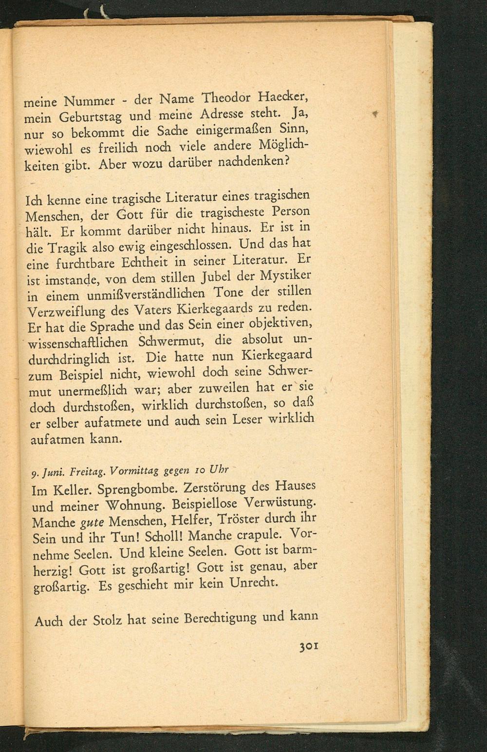 Im Keller. Sprengbombe. Zerstörung des Hauses und meiner Wohnung. Beispiellose Verwüstung. Manche gute Menschen, Helfer, Tröster durch ihr Sein und ihr Tun! Scholl! Manche crapule. Vornehme Seelen. Und kleine Seelen. Gott ist barmherzig! Gott ist großartig! Gott ist genau, aber großartig. Es geschieht mir kein Unrecht.