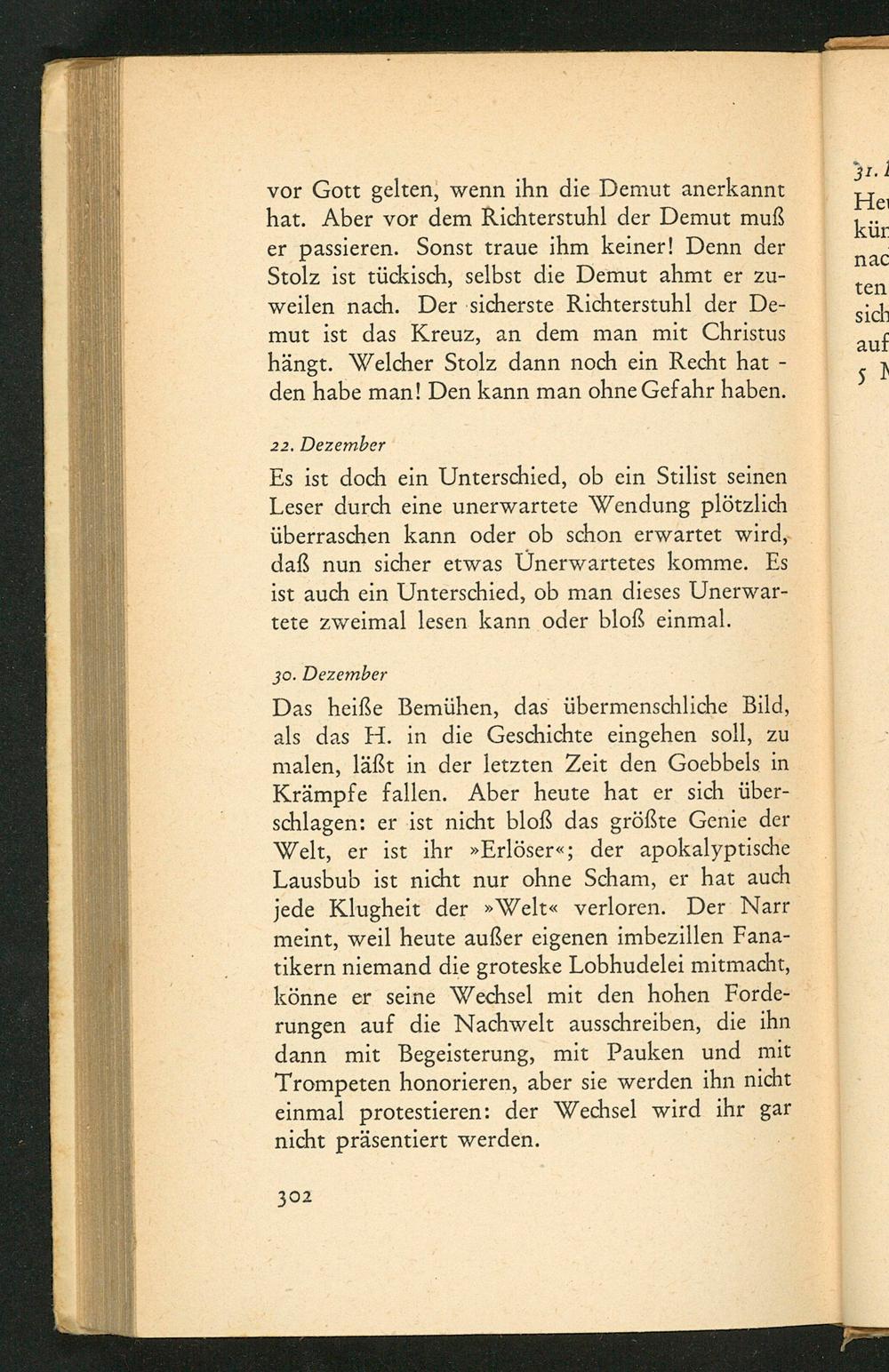Das heiße Bemühen, das übermenschliche Bild, als das H. in die Geschichte eingehen soll, zu malen, läßt in der letzten Zeit den Goebbels in Krämpfe fallen. Aber heute hat er sich überschlagen: er ist nicht bloß das größte Genie der Welt, er ist ihr» Erlöser«<; der apokalyptische Lausbub ist nicht nur ohne Scham, er hat auch jede Klugheit der» Welt« verloren. Der Narr meint, weil heute außer eigenen imbezillen Fanatikern niemand die groteske Lobhudelei mitmacht, könne er seine Wechsel mit den hohen Forderungen auf die Nachwelt ausschreiben, die ihn dann mit Begeisterung, mit Pauken und mit Trompeten honorieren, aber sie werden ihn nicht einmal protestieren: der Wechsel wird ihr gar nicht präsentiert werden.