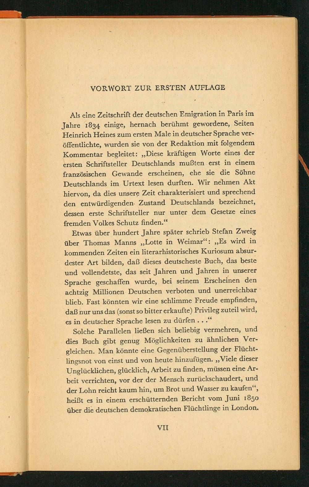 Als eine Zeitschrift der deutschen Emigration in Paris im Jahre 1834 einige, hernach berühmt gewordene, Seiten Heinrich Heines zum ersten Male in deutscher Sprache veröffentlichte, wurden sie von der Redaktion mit folgendem Kommentar begleitet: ,, Diese kräftigen Worte eines der ersten Schriftsteller Deutschlands mußten erst in einem französischen Gewande erscheinen, ehe sie die Söhne Deutschlands im Urtext lesen durften. Wir nehmen Akt hiervon, da dies unsere Zeit charakterisiert und sprechend den entwürdigenden Zustand Deutschlands bezeichnet, dessen erste Schriftsteller nur unter dem Gesetze eines fremden Volkes Schutz finden."