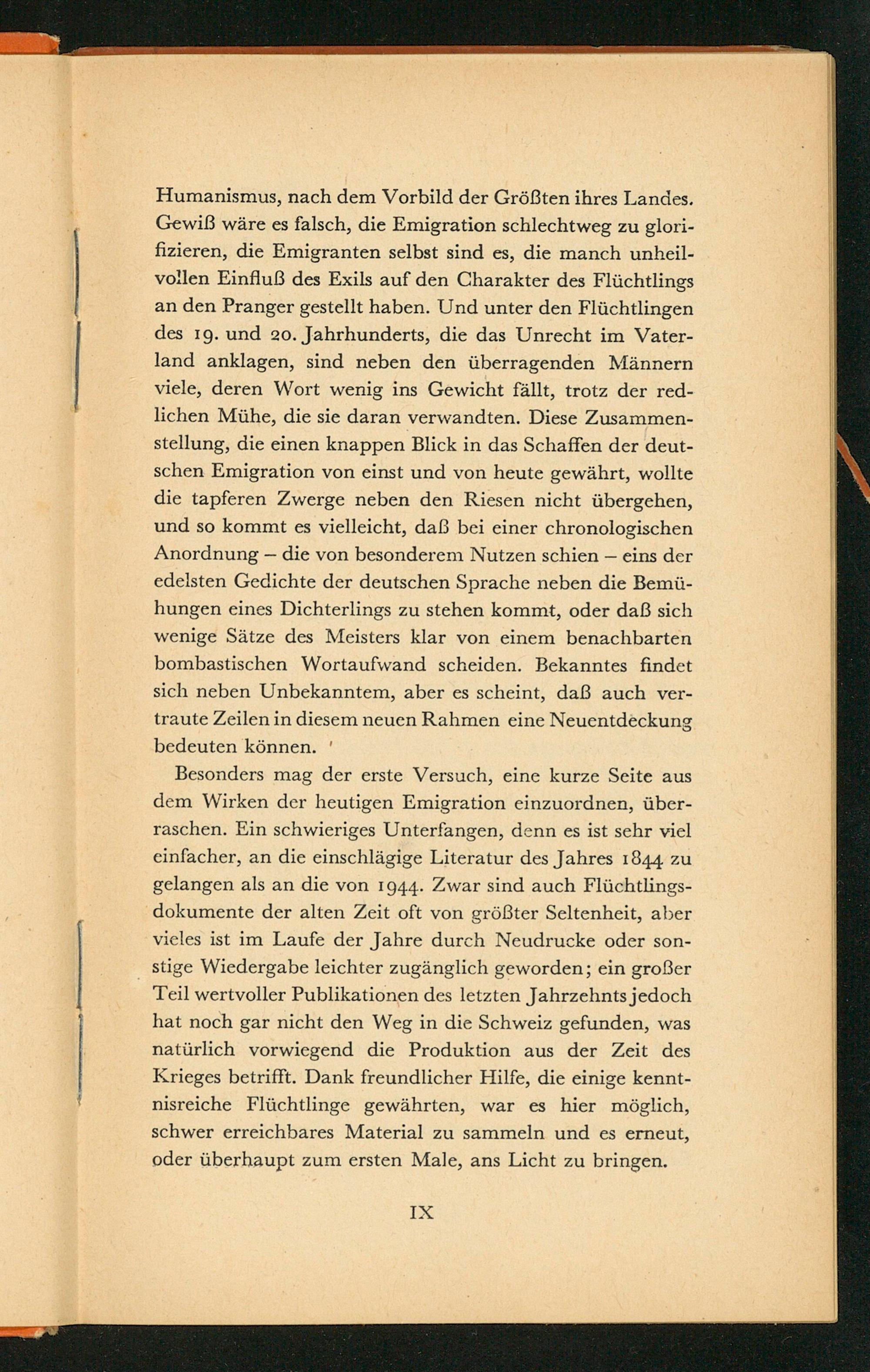 Besonders mag der erste Versuch, eine kurze Seite aus dem Wirken der heutigen Emigration einzuordnen, überraschen. Ein schwieriges Unterfangen, denn es ist sehr viel einfacher, an die einschlägige Literatur des Jahres 1844 zu gelangen als an die von 1944. Zwar sind auch Flüchtlingsdokumente der alten Zeit oft von größter Seltenheit, aber vieles ist im Laufe der Jahre durch Neudrucke oder sonstige Wiedergabe leichter zugänglich geworden; ein großer Teil wertvoller Publikationen des letzten Jahrzehnts jedoch hat noch gar nicht den Weg in die Schweiz gefunden, was natürlich vorwiegend die Produktion aus der Zeit des Krieges betrifft. Dank freundlicher Hilfe, die einige kenntnisreiche Flüchtlinge gewährten, war es hier möglich, schwer erreichbares Material zu sammeln und es erneut, oder überhaupt zum ersten Male, ans Licht zu bringen.