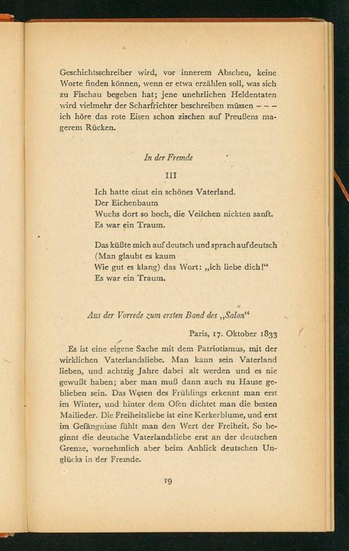 Es ist eine eigene Sache mit dem Patriotismus, mit der wirklichen Vaterlandsliebe. Man kann sein Vaterland lieben, und achtzig Jahre dabei alt werden und es nie gewußt haben; aber man muß dann auch zu Hause geblieben sein. Das Wesen des Frühlings erkennt man erst im Winter, und hinter dem Ofen dichtet man die besten Mailieder. Die Freiheitsliebe ist eine Kerkerblume, und erst im Gefängnisse fühlt man den Wert der Freiheit. So beginnt die deutsche Vaterlandsliebe erst an der deutschen Grenze, vornehmlich aber beim Anblick deutschen Unglücks in der Fremde.