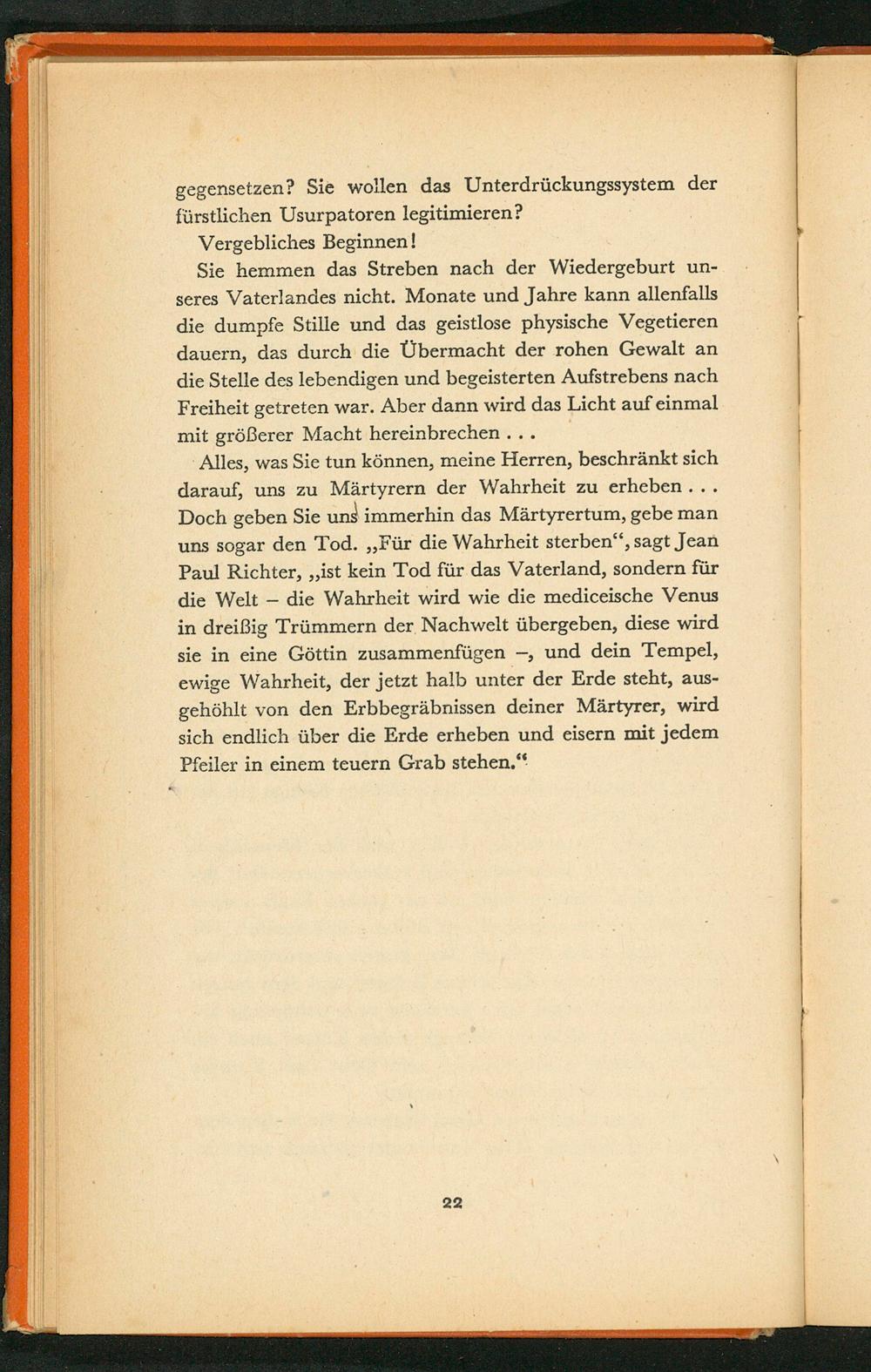 Alles, was Sie tun können, meine Herren, beschränkt sich darauf, uns zu Märtyrern der Wahrheit zu erheben... Doch geben Sie uns immerhin das Märtyrertum, gebe man uns sogar den Tod. ,, Für die Wahrheit sterben", sagt Jean Paul Richter ,,, ist kein Tod für das Vaterland, sondern für die Welt die Wahrheit wird wie die mediceische Venus in dreißig Trümmern der Nachwelt übergeben, diese wird sie in eine Göttin zusammenfügen-, und dein Tempel, ewige Wahrheit, der jetzt halb unter der Erde steht, ausgehöhlt von den Erbbegräbnissen deiner Märtyrer, wird sich endlich über die Erde erheben und eisern mit jedem Pfeiler in einem teuern Grab stehen."