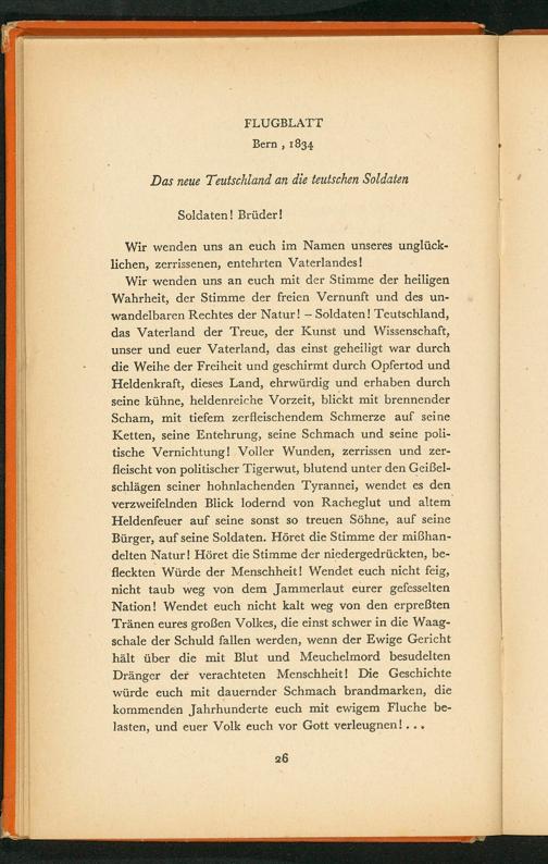 Wir wenden uns an euch mit der Stimme der heiligen Wahrheit, der Stimme der freien Vernunft und des unwandelbaren Rechtes der Natur!- Soldaten! Teutschland, das Vaterland der Treue, der Kunst und Wissenschaft, unser und euer Vaterland, das einst geheiligt war durch die Weihe der Freiheit und geschirmt durch Opfertod und Heldenkraft, dieses Land, ehrwürdig und erhaben durch seine kühne, heldenreiche Vorzeit, blickt mit brennender Scham, mit tiefem zerfleischendem Schmerze auf seine Ketten, seine Entehrung, seine Schmach und seine politische Vernichtung! Voller Wunden, zerrissen und zerfleischt von politischer Tigerwut, blutend unter den Geißelschlägen seiner hohnlachenden Tyrannei, wendet es den verzweifelnden Blick lodernd von Racheglut und altem Heldenfeuer auf seine sonst so treuen Söhne, auf seine Bürger, auf seine Soldaten. Höret die Stimme der miẞhandelten Natur! Höret die Stimme der niedergedrückten, befleckten Würde der Menschheit! Wendet euch nicht feig, nicht taub weg von dem Jammerlaut eurer gefesselten Nation! Wendet euch nicht kalt weg von den erpreẞten Tränen eures großen Volkes, die einst schwer in die Waagschale der Schuld fallen werden, wenn der Ewige Gericht hält über die mit Blut und Meuchelmord besudelten Dränger der verachteten Menschheit! Die Geschichte würde euch mit dauernder Schmach brandmarken, die kommenden Jahrhunderte euch mit ewigem Fluche belasten, und euer Volk euch vor Gott verleugnen!...