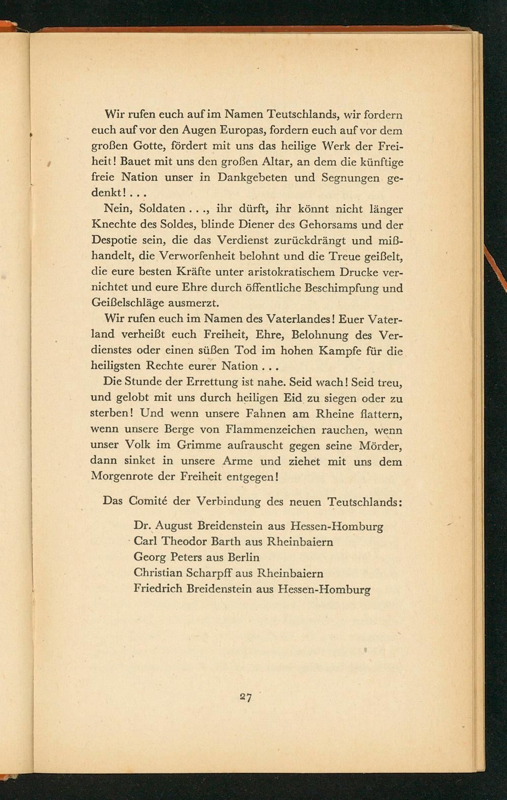 Wir rufen euch auf im Namen Teutschlands, wir fordern euch auf vor den Augen Europas , fordern euch auf vor dem großen Gotte, fördert mit uns das heilige Werk der Freiheit! Bauet mit uns den großen Altar, an dem die künftige freie Nation unser in Dankgebeten und Segnungen gedenkt!...