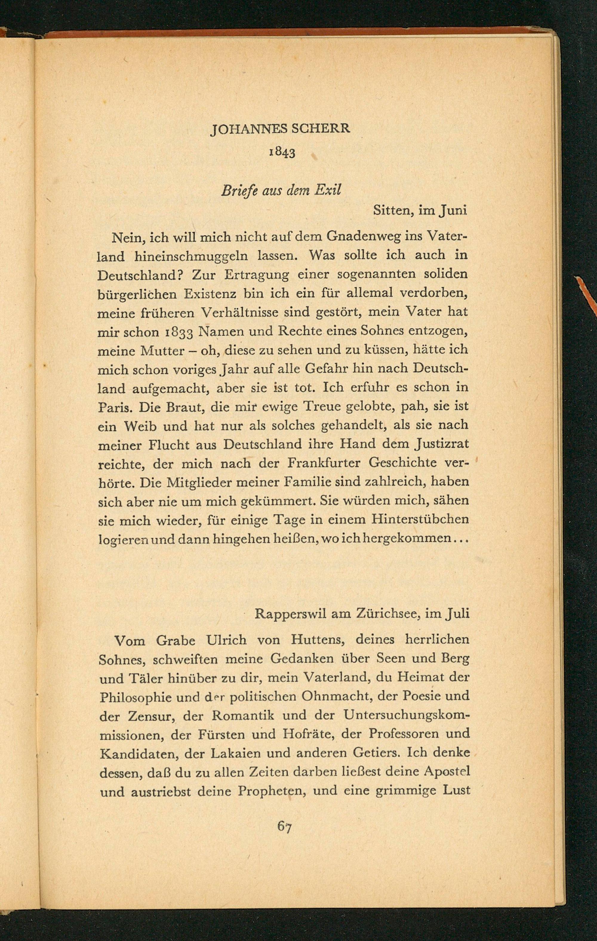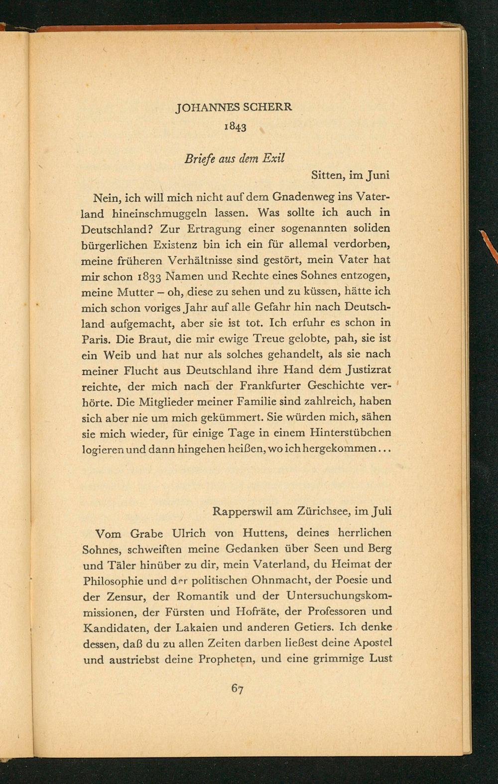 Vom Grabe Ulrich von Huttens, deines herrlichen Sohnes, schweiften meine Gedanken über Seen und Berg und Täler hinüber zu dir, mein Vaterland, du Heimat der Philosophie und der politischen Ohnmacht, der Poesie und der Zensur, der Romantik und der Untersuchungskommissionen, der Fürsten und Hofräte, der Professoren und Kandidaten, der Lakaien und anderen Getiers. Ich denke dessen, daß du zu allen Zeiten darben ließest deine Apostel und austriebst deine Propheten, und eine grimmige Lust