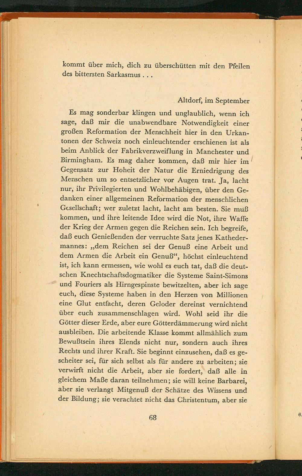 Es mag sonderbar klingen und unglaublich, wenn ich sage, daß mir die unabwendbare Notwendigkeit einer großen Reformation der Menschheit hier in den Urkantonen der Schweiz noch einleuchtender erschienen ist als beim Anblick der Fabrikverzweiflung in Manchester und Birmingham . Es mag daher kommen, daß mir hier im Gegensatz zur Hoheit der Natur die Erniedrigung des Menschen um so entsetzlicher vor Augen trat. Ja, lacht nur, ihr Privilegierten und Wohlbehäbigen, über den Gedanken einer allgemeinen Reformation der menschlichen Gesellschaft; wer zuletzt lacht, lacht am besten. Sie muß kommen, und ihre leitende Idee wird die Not, ihre Waffe der Krieg der Armen gegen die Reichen sein. Ich begreife, daß euch Genießenden der verruchte Satz jenes Kathedermannes: ,, dem Reichen sei der Genuß eine Arbeit und dem Armen die Arbeit ein Genuß", höchst einleuchtend ist, ich kann ermessen, wie wohl es euch tat, daß die deutschen Knechtschaftsdogmatiker die Systeme Saint- Simons und Fouriers als Hirngespinste bewitzelten, aber ich sage euch, diese Systeme haben in den Herzen von Millionen eine Glut entfacht, deren Geloder dereinst vernichtend über euch zusammenschlagen wird. Wohl seid ihr die Götter dieser Erde, aber eure Götterdämmerung wird nicht ausbleiben. Die arbeitende Klasse kommt allmählich zum Bewußtsein ihres Elends nicht nur, sondern auch ihres Rechts und ihrer Kraft. Sie beginnt einzusehen, daß es gescheiter sei, für sich selbst als für andere zu arbeiten; sie verwirft nicht die Arbeit, aber sie fordert, daß alle in gleichem Maße daran teilnehmen; sie will keine Barbarei, aber sie verlangt Mitgenuß der Schätze des Wissens und der Bildung; sie verachtet nicht das Christentum, aber sie