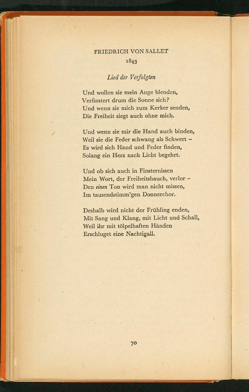 Und wenn sie mir die Hand auch binden, Weil sie die Feder schwang als Schwert— Es wird sich Hand und Feder finden, Solang ein Herz nach Licht begehrt.