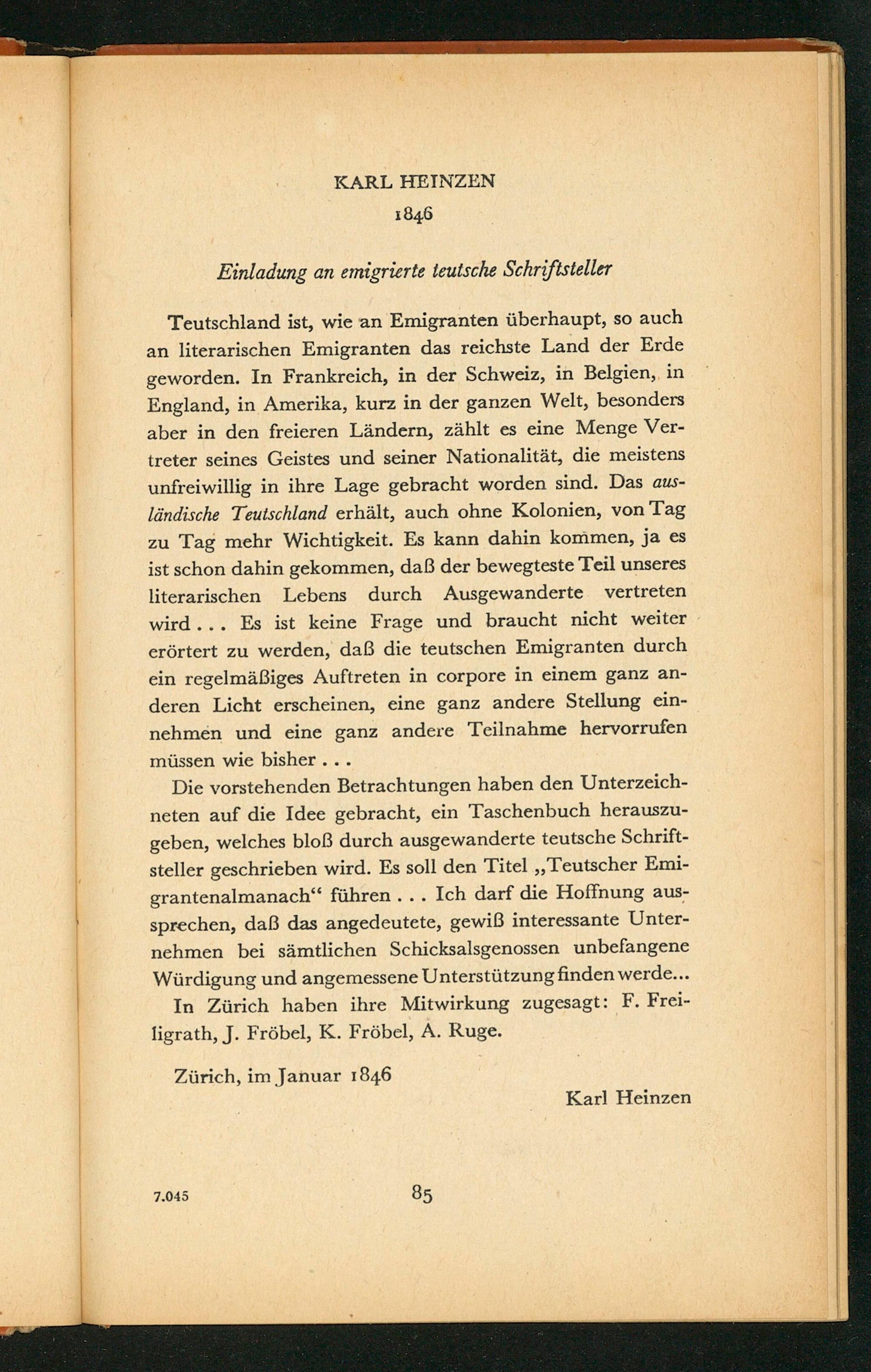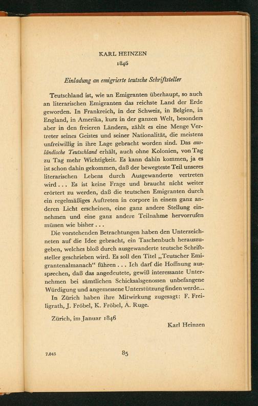 Die vorstehenden Betrachtungen haben den Unterzeichneten auf die Idee gebracht, ein Taschenbuch herauszugeben, welches bloß durch ausgewanderte teutsche Schriftsteller geschrieben wird. Es soll den Titel ,, Teutscher Emigrantenalmanach" führen... Ich darf die Hoffnung aussprechen, daß das angedeutete, gewiß interessante Unternehmen bei sämtlichen Schicksalsgenossen unbefangene Würdigung und angemessene Unterstützung finden werde... In Zürich haben ihre Mitwirkung zugesagt: F. Freiligrath, J. Fröbel, K. Fröbel, A. Ruge .