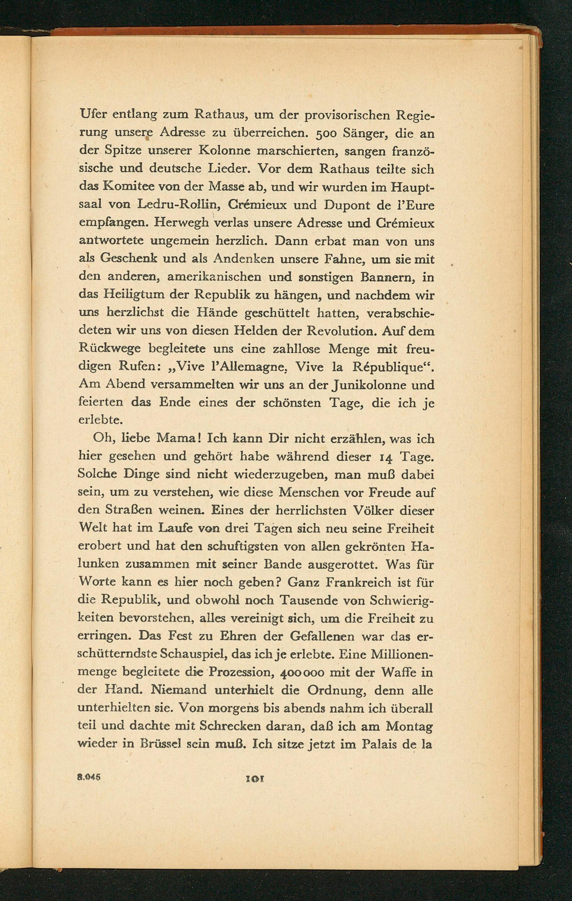 Oh, liebe Mama! Ich kann Dir nicht erzählen, was ich hier gesehen und gehört habe während dieser ı4 Tage. Solche Dinge sind nicht wiederzugeben, man muß dabei sein, um zu verstehen, wie diese Menschen vor Freude auf den Straßen weinen. Eines der herrlichsten Völker dieser Welt hat im Laufe von drei Tagen sich neu seine Freiheit erobert und hat den schuftigsten von allen gekrönten Ha- lunken zusammen mit seiner Bande ausgerottet. Was für Worte kann es hier noch geben? Ganz Frankreich ist für die Republik , und obwohl noch Tausende von Schwierig- keiten bevorstehen, alles vereinigt sich, um die Freiheit zu erringen. Das Fest zu Ehren der Gefallenen war das er- schütterndste Schauspiel, das ich je erlebte. Eine Millionen- menge begleitete die Prozession, 400000 mit der Waffe in der Hand. Niemand unterhielt die Ordnung, denn alle unterhielten sie. Von morgens bis abends nahm ich überall teil und dachte mit Schrecken daran, daß ich am Montag wieder in Brüssel sein muß. Ich sitze jetzt im Palais de la