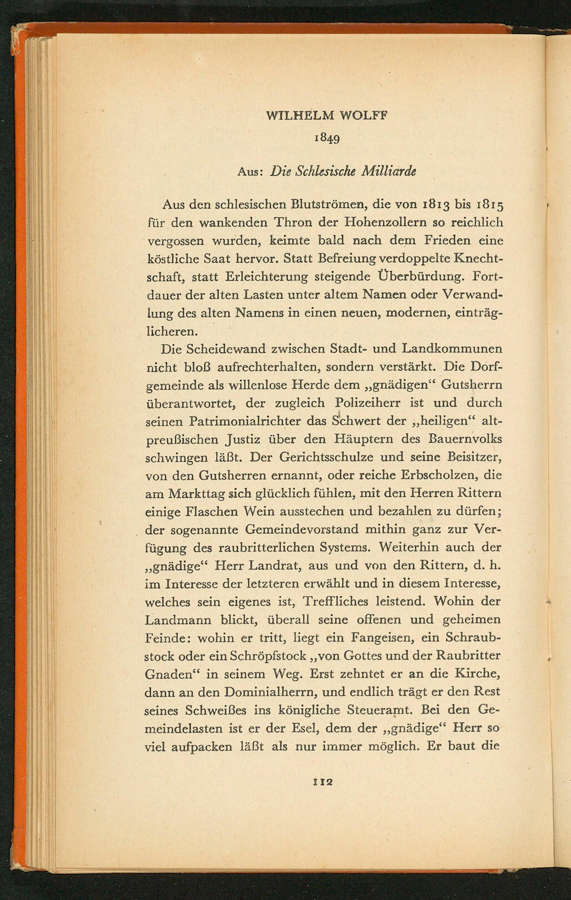 Aus den schlesischen Blutströmen, die von 1813 bis ı815 für den wankenden Thron der Hohenzollern so reichlich vergossen wurden, keimte bald nach dem Frieden eine köstliche Saat hervor. Statt Befreiung verdoppelte Knecht- schaft, statt Erleichterung steigende Überbürdung. Fort- dauer der alten Lasten unter altem Namen oder Verwand- lung des alten Namens in einen neuen, modernen, einträg- licheren.
