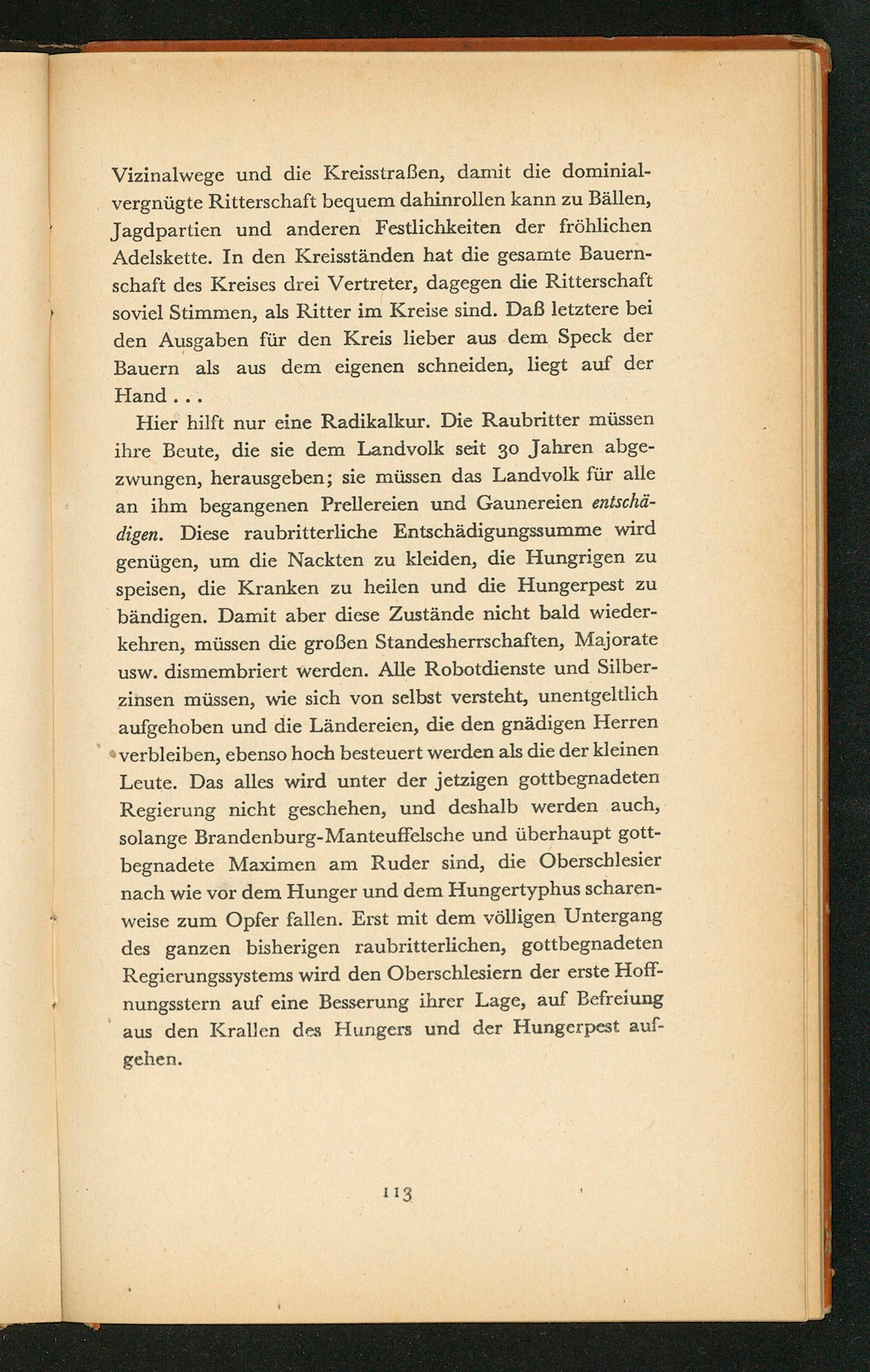 Vizinalwege und die Kreisstraßen, damit die dominial- vergnügte Ritterschaft bequem dahinrollen kann zu Bällen, Jagdpartien und anderen Festlichkeiten der fröhlichen Adelskette. In den Kreisständen hat die gesamte Bauern- schaft des Kreises drei Vertreter, dagegen die Ritterschaft N soviel Stimmen, als Ritter im Kreise sind. Daß letztere bei | den Ausgaben für den Kreis lieber aus dem Speck der | Bauern als aus dem eigenen schneiden, liegt auf der Hand... Hier hilft nur eine Radikalkur. Die Raubritter müssen ihre Beute, die sie dem Landvolk seit 30 Jahren abge- zwungen, herausgeben; sie müssen das Landvolk für alle an ihm begangenen Prellereien und Gaunereien enischä- digen. Diese raubritterliche Entschädigungssumme wird genügen, um die Nackten zu kleiden, die Hungrigen zu speisen, die Kranken zu heilen und die Hungerpest zu bändigen. Damit aber diese Zustände nicht bald wieder- kehren, müssen die großen Standesherrschaften, Majorate usw. dismembriert werden. Alle Robotdienste und Silber- zinsen müssen, wie sich von selbst versteht, unentgeltlich aufgehoben und die Ländereien, die den gnädigen Herren sverbleiben, ebenso hoch besteuert werden als die der kleinen Leute. Das alles wird unter der jetzigen gottbegnadeten Regierung nicht geschehen, und deshalb werden auch, solange Brandenburg-Manteuffelsche und überhaupt gott - begnadete Maximen am Ruder sind, die Oberschlesier nach wie vor dem Hunger und dem Hungertyphus scharen- weise zum Opfer fallen. Erst mit dem völligen Untergang des ganzen bisherigen raubritterlichen, gottbegnadeten Regierungssystems wird den Oberschlesiern der erste Hoff- nungsstern auf eine Besserung ihrer Lage, auf Befreiung aus den Krallen des Hungers und der Hungerpest auf- gehen.
