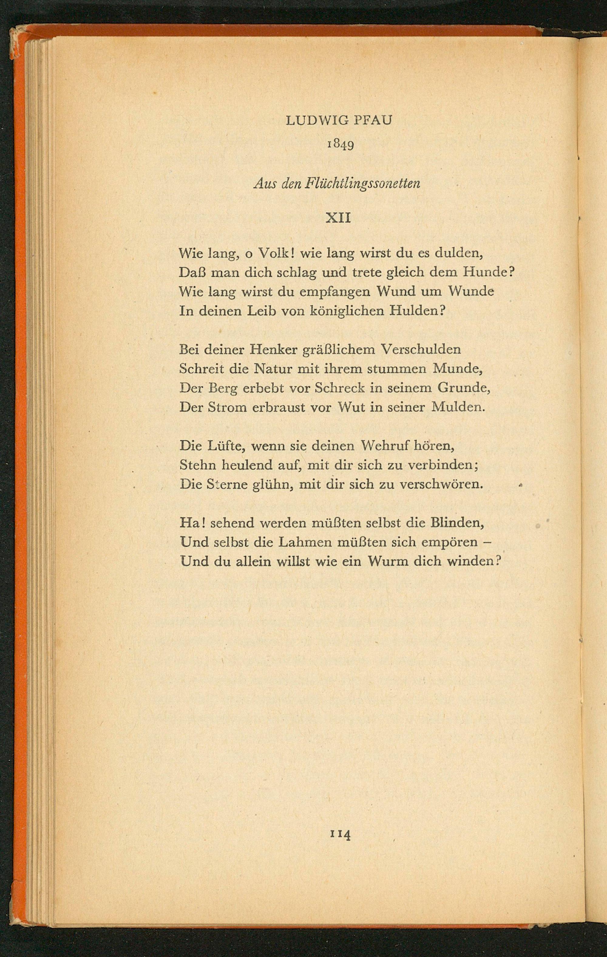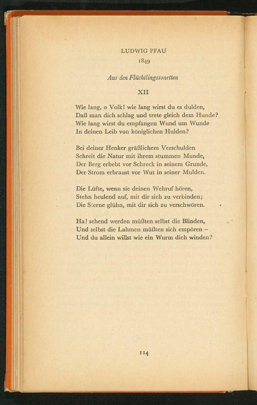 Wie lang, o Volk! wie lang wirst du es dulden, Daß man dich schlag und trete gleich dem Hunde? Wie lang wirst du empfangen Wund um Wunde