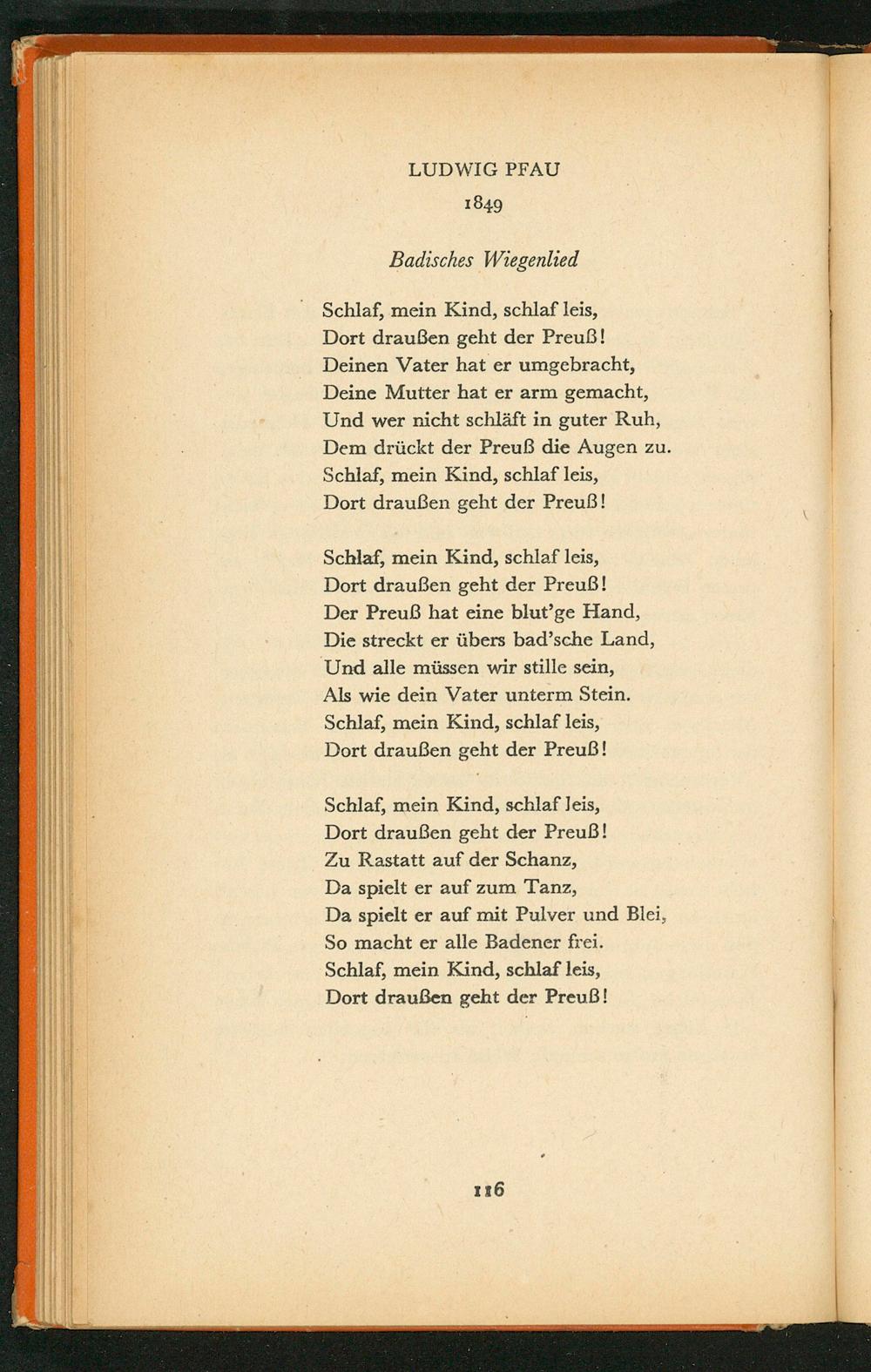 Dort draußen geht der Preuß! Deinen Vater hat er umgebracht, Deine Mutter hat er arm gemacht, Und wer nicht schläft in guter Ruh,