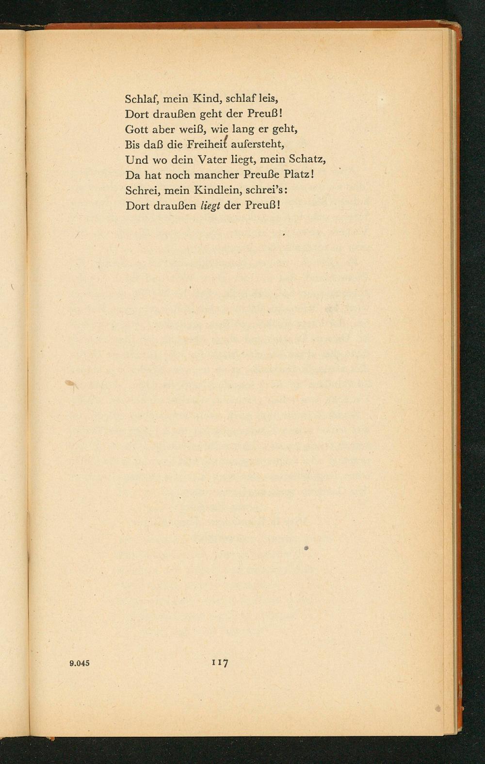 9.045 Schlaf, mein Kind, schlaf leis, Dort draußen geht der Preuß! Gott aber weiß, wie lang er geht, Bis daß die Freiheit aufersteht, Und wo dein Vater liegt, mein Schatz, Da hat noch mancher Preuße Platz! Schrei, mein Kindlein, schrei’s: Dort draußen liegt der Preuß! 117