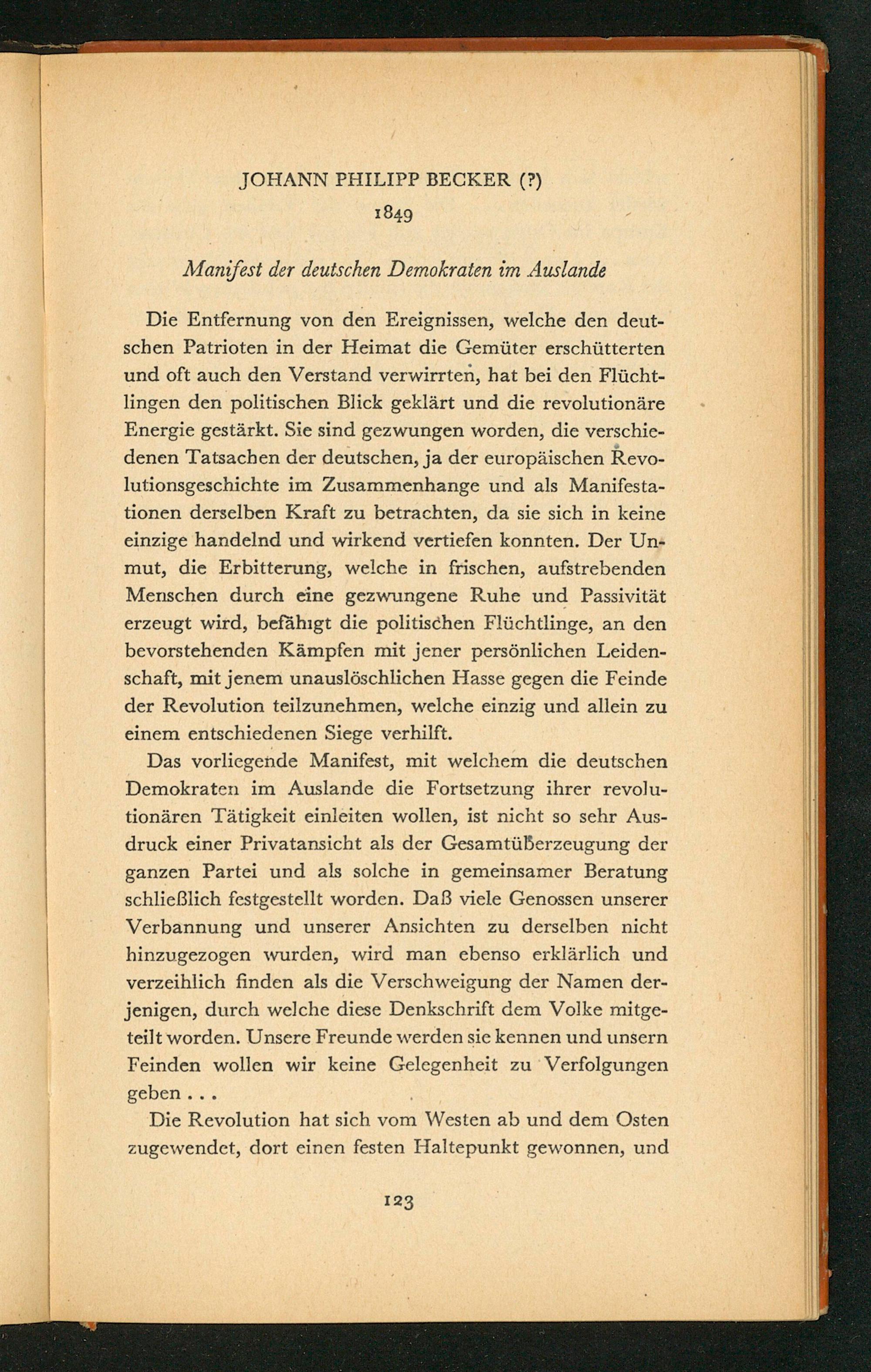 Das vorliegende Manifest, mit welchem die deutschen Demokraten im Auslande die Fortsetzung ihrer revolutionären Tätigkeit einleiten wollen, ist nicht so sehr Ausdruck einer Privatansicht als der Gesamtüberzeugung der ganzen Partei und als solche in gemeinsamer Beratung schließlich festgestellt worden. Daß viele Genossen unserer Verbannung und unserer Ansichten zu derselben nicht hinzugezogen wurden, wird man ebenso erklärlich und verzeihlich finden als die Verschweigung der Namen derjenigen, durch welche diese Denkschrift dem Volke mitgeteilt worden. Unsere Freunde werden sie kennen und unsern Feinden wollen wir keine Gelegenheit zu Verfolgungen geben...
