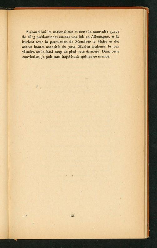 Aujourd'hui les nationalistes et toute la mauvaise queue de 1815 prédominent encore une fois en Allemagne , et ils hurlent avec la permission de Monsieur le Maire et des autres hautes autorités du pays. Hurlez toujours! le jour viendra où le fatal coup de pied vous écrasera. Dans cette conviction, je puis sans inquiétude quitter ce monde.